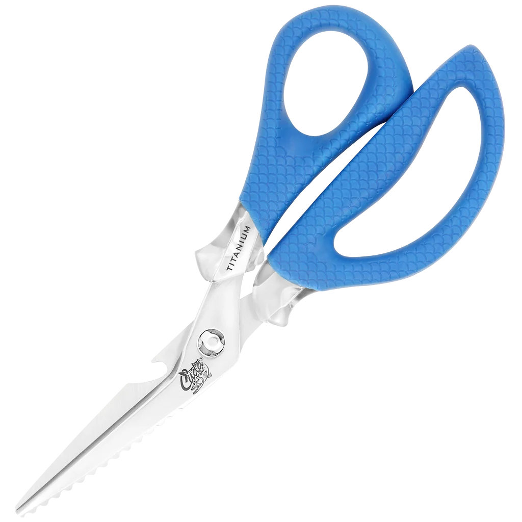 This 8" Marine Shear features detachable handles for easy cleaning. Blades are Titanium Bonded High-Carbon Steel which is 3x harder than untreated steel and will stay sharper longer. One blade edge can be used as a fish scaler and another blade has an integrated bottle opener. Cutting edges are serrated for increased performance. Full tang construction and non-slip Cuda scale pattern handles.