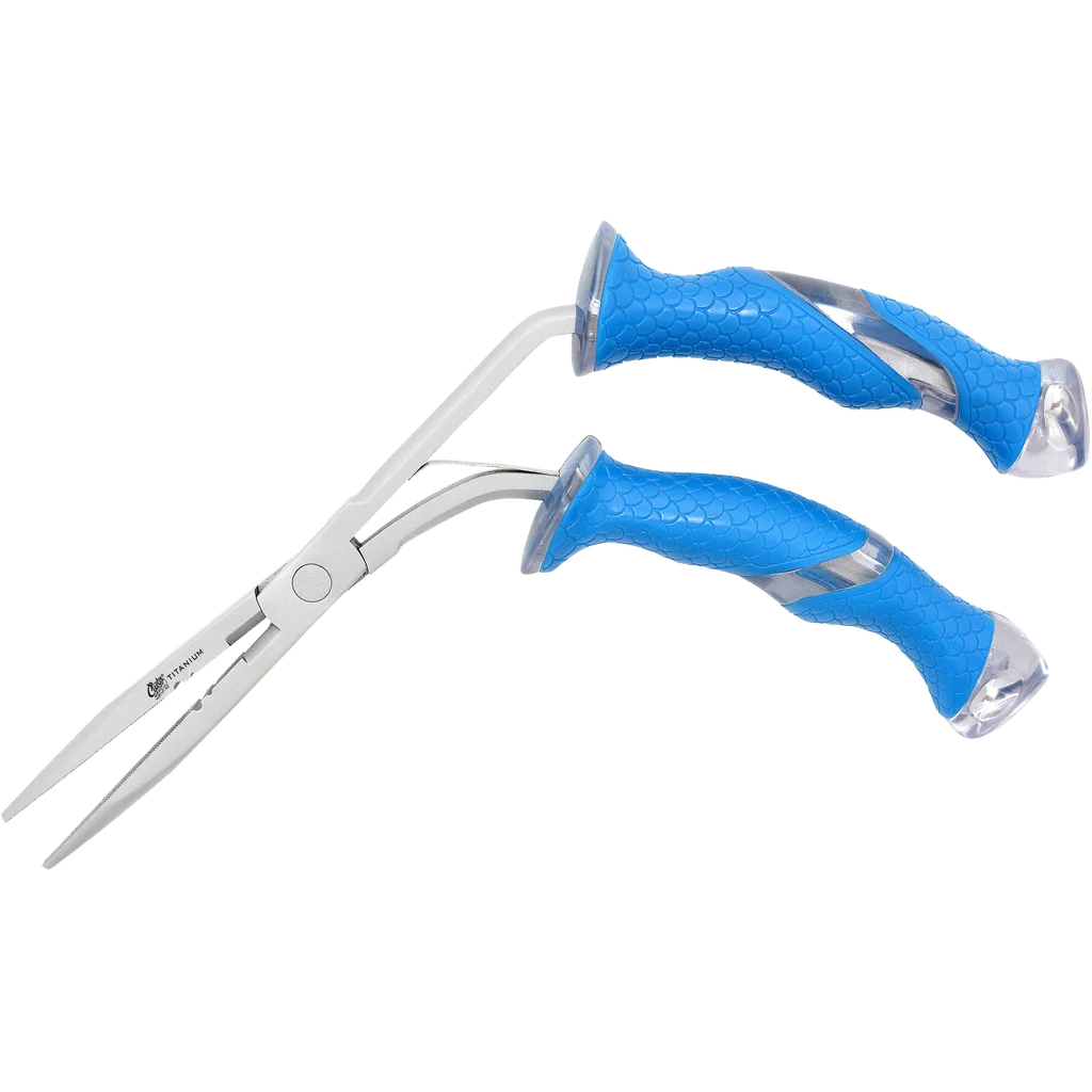 The pistol grip design on this 9" freshwater plier allows for easier reach and removal of hooks. The Cuda scale pattern grips are non-slip and and the Titanium Bonded stainless steel construction provides increased corrosion-resistance. Features a long nose and integrated crimper. Cuts wire, fluorocarbon and wire