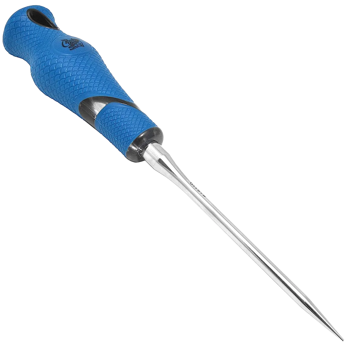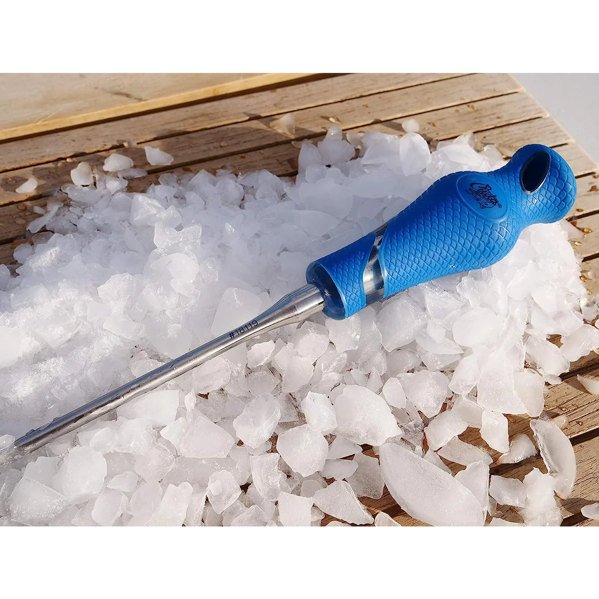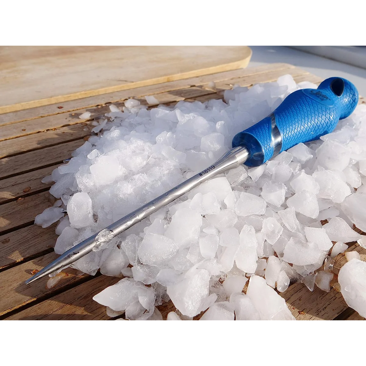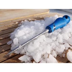 For breaking up blocks and shaved ice and for separating frozen bait. The stainless steel shaft has increased corrosion resistant and is full tang for strength and durability. The handle features a non-slip, ergonomic design that allows for top or side hand position. Includes a tip cap and a hang hole