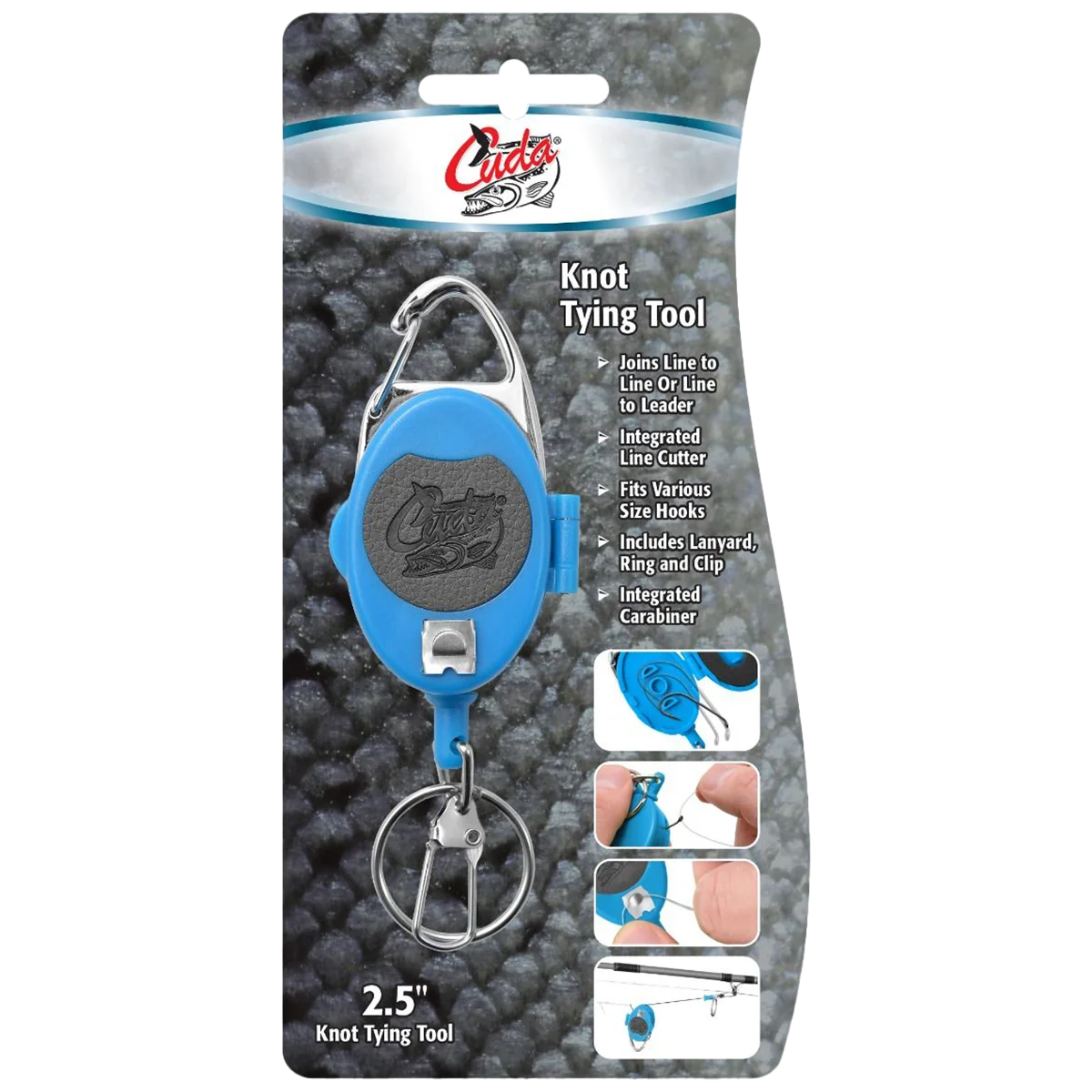 This handy Cuda knot tying tool is the perfect accessory for your tackle box. Fits various sized hooks that can be placed inside the casing, with the eye end accessible for easy knot tying. Makes joining line to line or line to leader a snap and swivels for easier tying. The integrated carabiner and clip can attach to your backpack, tool sheath or to your rod, to protect from exposed hooks. The knot tying tool also features a handy exterior line cutter and zinger lanyard.