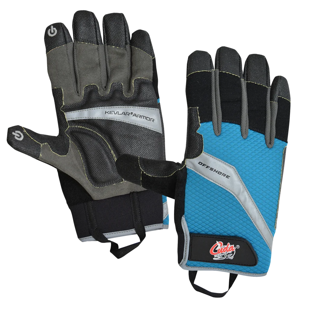 The Cuda Offshore Gloves are purpose built for both offshore and everyday use. Each pair features a neoprene and microfiber construction, along with padded Kevlar palms that are cut resistant for comfort, safety, and maximum dexterity. A reflective strip is also built in for enhanced visibility, complimented by a convenient pull loop for easy removal. Water-repellent and made complete with an index finger and thumb designed to work on touch screens, the velcro closure ensures that all the aforementioned elements come together in perfect unison to deliver elite protection no matter the conditions. Available in multiple sizes as well, everyone can experience the tough and proven performance of the Cuda Offshore Gloves. Neoprene and Microfiber construction Cut Resistant Kevlar palms Reflective strip for visibility Pull loop for easy removal Water repellent Index finger and thumb designed to work on touch screens Velcro closure for secure fit Available in multiple sizes
