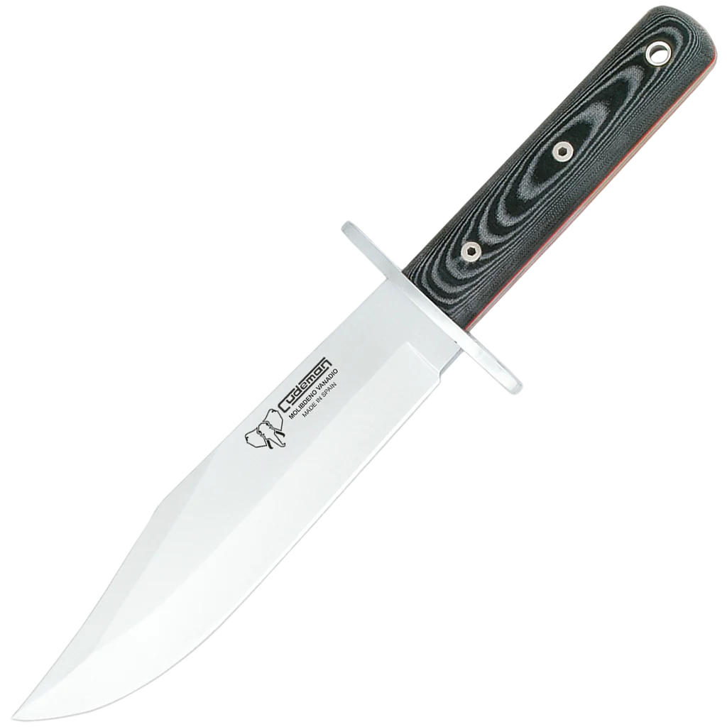 El Cudeman JBK II is a modern interpretation of the classic Bowie blade, combining traditional form with contemporary materials. The 20 cm hollow-ground blade in molybdenum‑vanadium steel is satin-finished and 4.8 mm thick, giving a stiff, dependable edge for demanding cutting and camp tasks. The design uses an integral full-tang construction and a satin stainless steel guard for strength and control. The handle features black satin micarta scales with a contrasting red spacer, secured by a stainless Allen screw and a brass-threaded inner bushing, providing a secure grip even in wet conditions. A black leather sheath with red stitching is included for carry and protection. The knife's balance, durable steel and practical finishing make the JBK II a versatile fixed-blade tool for outdoor and general utility use.