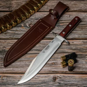 The El Cudeman JBK I (Ref. 106) is a classic Bowie-style fixed blade built on a full-tang molybdenum‑vanadium steel blank. With a 25 cm satin-finished hollow-grind blade and a generous 13 cm red stamina handle, this knife is designed for robust general outdoor and utility tasks where a dependable, full-size knife is required. The blade profile and 4.8 mm thickness give strength at the point and edge while the satin finish reduces glare and eases maintenance. Construction details include an A-420 satin stainless crossguard, aluminium rivet handle anchoring and a full-tang structure for durability and balance. The knife is supplied with a brown leather sheath (approx. 150 g). Take care when sheathing: the tip is extremely sharp and should be inserted with minimal resistance to avoid cutting the leather. Model name and supplier: JBK I (Ref. 106) by Cudeman.