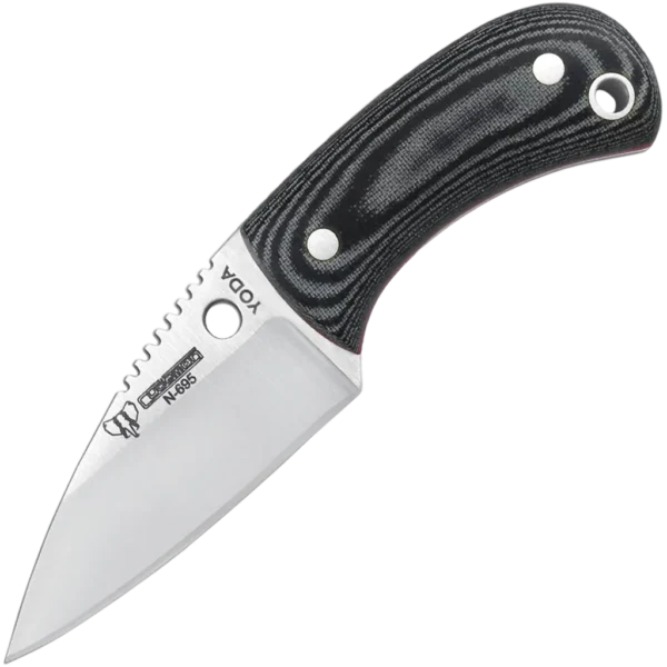 - 5.5 cm black Micarta handle with red spacer, secured by a flat aluminium rivet for a secure, durable grip.