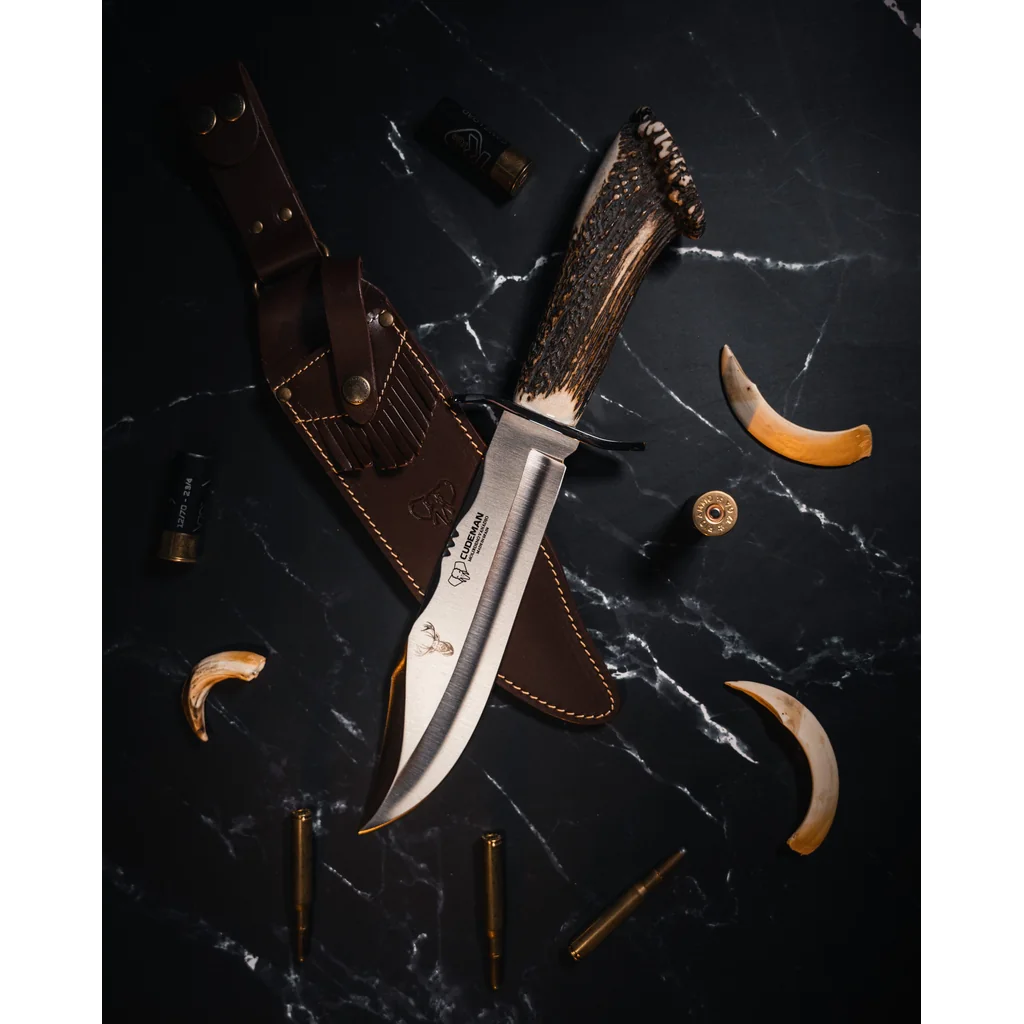 This Cudeman fixed-blade Bowie combines traditional styling with solid construction for dependable performance in camp and outdoor tasks. The 24.5 cm hollow-ground blade has a satin finish and a pronounced Bowie point that delivers strength for heavier work while the hollow grind helps produce clean slices and easier sharpening. The blade steel is a molybdenum‑vanadium alloy, heat-treated to 54–56 HRC to balance edge retention with toughness. The knife features a threaded full tang and a polished deer-rosette handle that gives a firm, comfortable hold and an attractive, classic appearance. A polished A-304 stainless crossguard/bolster adds protection and corrosion resistance. Supplied with a brown leather sheath (approx. 170 g) for safe storage and transport, the knife measures approximately 41 cm overall and weighs roughly 510 g — a substantial tool for a wide range of outdoor and camp tasks.
