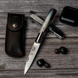A compact folding knife that combines traditional materials with practical performance. The 9 cm ground blade features a broad stiletto point with a satin finish, offering a neat, controllable profile for detailed cutting tasks. The blade is made from molybdenum‑vanadium steel, heat-treated to 54–56 HRC, balancing edge retention with ease of maintenance. The handle is polished bull horn, fitted with a polished A‑304 stainless ferrule and secured by a brass pin, giving the knife a classic aesthetic and secure feel in the hand. The piston locking system provides dependable blade retention when open. At 20 cm overall and around 80 g, it is compact and portable, and it comes complete with a black leather sheath (Ref. 606-N) for organised storage and carry.