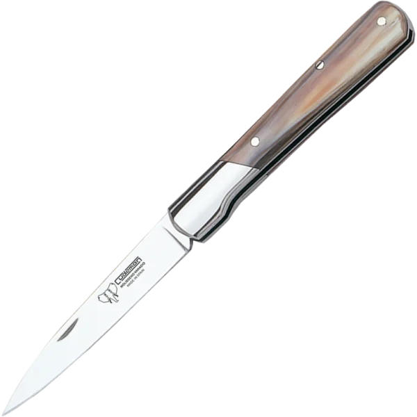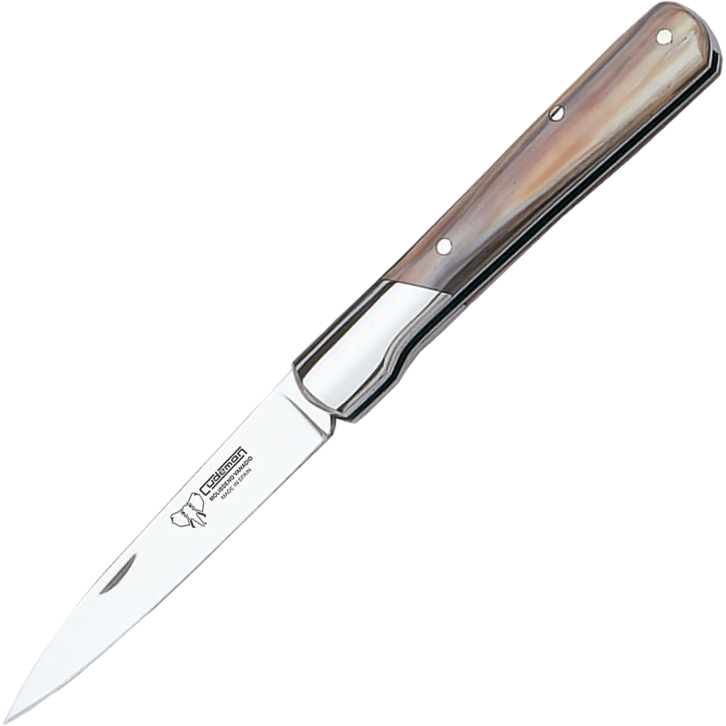 The Cudeman folding knife is a compact, elegant tool that blends traditional materials with dependable modern steel. With a 9 cm satin-ground blade and a 20 cm overall length, it offers a practical size and balance for a wide range of everyday tasks. The wide stiletto-style point and 2.5 mm blade thickness provide precise control while retaining useful strength for cutting and utility work. The knife weighs approximately 80 g, making it easy to handle and carry. Construction is solid and thoughtfully detailed: the blade is made from molybdenum-vanadium steel, heat-treated to 54–56 HRC and finished in satin. The handle is polished bull horn with a polished A-304 stainless bolster and a brass anchoring pin, combining durability with classic looks. A piston locking system secures the blade when open. A matching black leather sheath (Ref. 606-N) is available separately; the sheath is not included. As a natural material, the bull-horn handle benefits from basic care to maintain appearance over time.