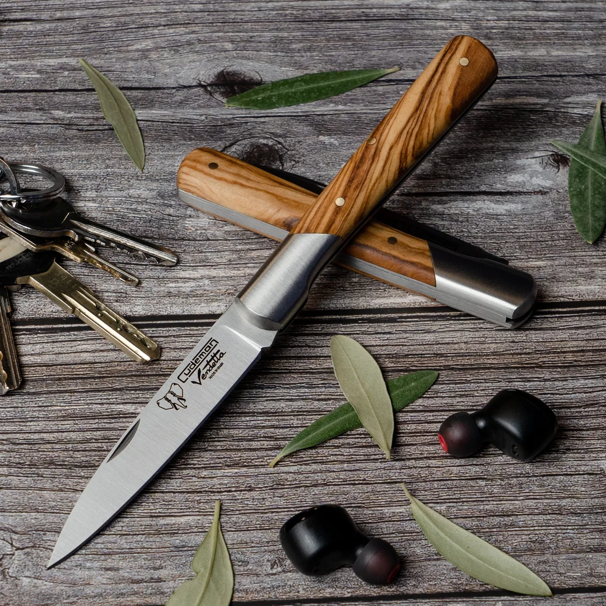 The Cudeman folding knife pairs classic materials with compact, practical design. Its 9 cm satin-ground blade features a wide stiletto/spear point profile that delivers controlled, accurate cuts while the 2.5 mm thickness and 1.5 cm blade width provide a stable cutting platform. The blade's molybdenum‑vanadium steel and 54–56 HRC heat treatment give a reliable balance between edge life and ease of maintenance. The handle is crafted from natural satin-finished olive wood, 11 cm long for comfortable handling, and finished with a polished A-304 stainless bolster and brass pin anchoring for resilient, attractive construction. The folding mechanism uses a piston locking system to keep the blade secure when open; the knife weighs approximately 80 g for easy carry. A brown leather sheath (Ref. 606-C) is available separately if you prefer a dedicated carry option — sheath not included.