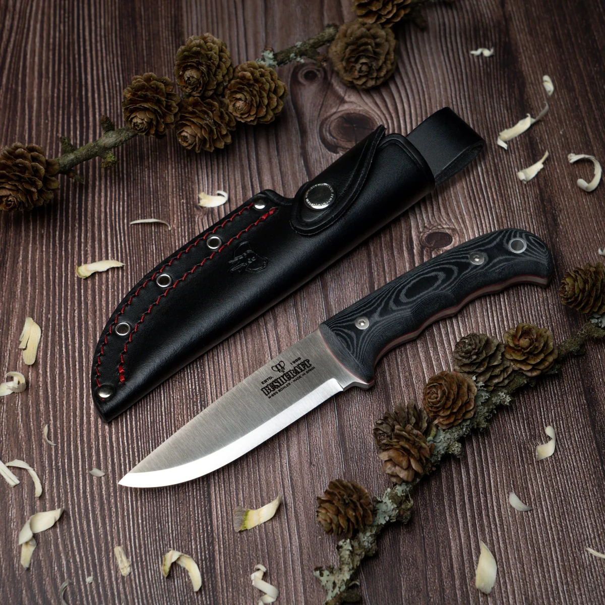- Böhler N-695 stainless steel, heat-treated to 59–60 HRC for strong edge retention and good corrosion resistance.