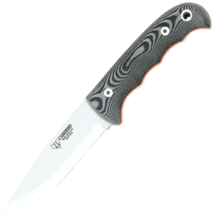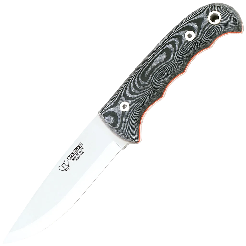 The Cudeman fixed-blade knife is built around a full-tang design that prioritises strength and reliable performance. With an 11 cm Scandinavian-ground blade finished in satin and a 4 mm spine, it delivers a sturdy, controllable cutting profile suitable for a wide range of outdoor and utility tasks. The Böhler N-695 blade steel is heat-treated to 59–60 HRC to provide a balance of edge retention and corrosion resistance. Comfort and durability extend to the handle, which uses brown satin Micarta with a black spacer and is anchored by a stainless allen screw and a threaded brass inner ferrule. The knife comes complete with a black leather sheath for secure carry and protection. At 22 cm overall and approximately 220 g, this knife is compact enough for everyday outdoor work while remaining robust enough for demanding tasks.