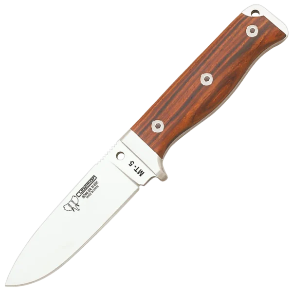 Spanish company Cudeman make some very high quality knives and the MT5 is their latest addition. Very popular in the bushcraft world this knife has the reputation of being well designed, well made and easy to use. The blade is 4.33" of Bohler N695 steel, flat ground and 60HRC, a full broad tang, 5mm stock at the handle and tapered to the blade tip for great cutting power and control. Excellent choice as an all-round bushcraft knife, or outdoor general purpose knife. The removeable slabs are satin polished Cocobolo Wood, the tang is extended to provide a lanyard hole and stainless bolsters make for a very sturdy outdoor knife. Kit Includes: 280cm of Paracord Leather Sheath/Carry case Flint Signal Mirror Sharpening Stone