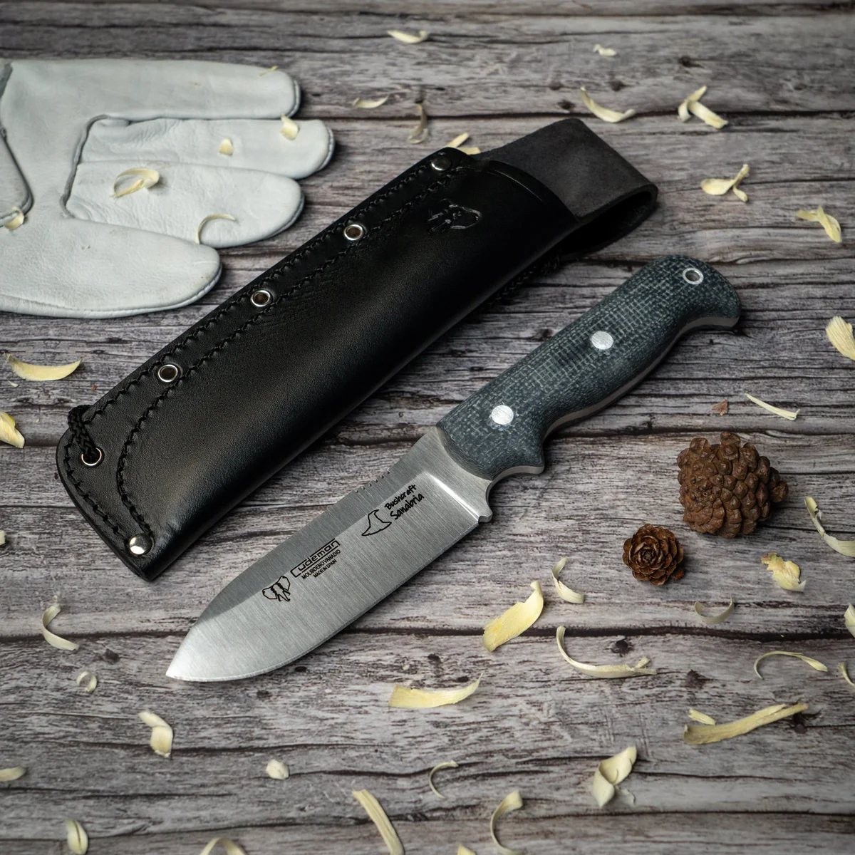 - 12 cm black jute handle secured with flat aluminium rivets — full-tang build with an integrated striker on the handle for friction fire starting and a lanyard pin.