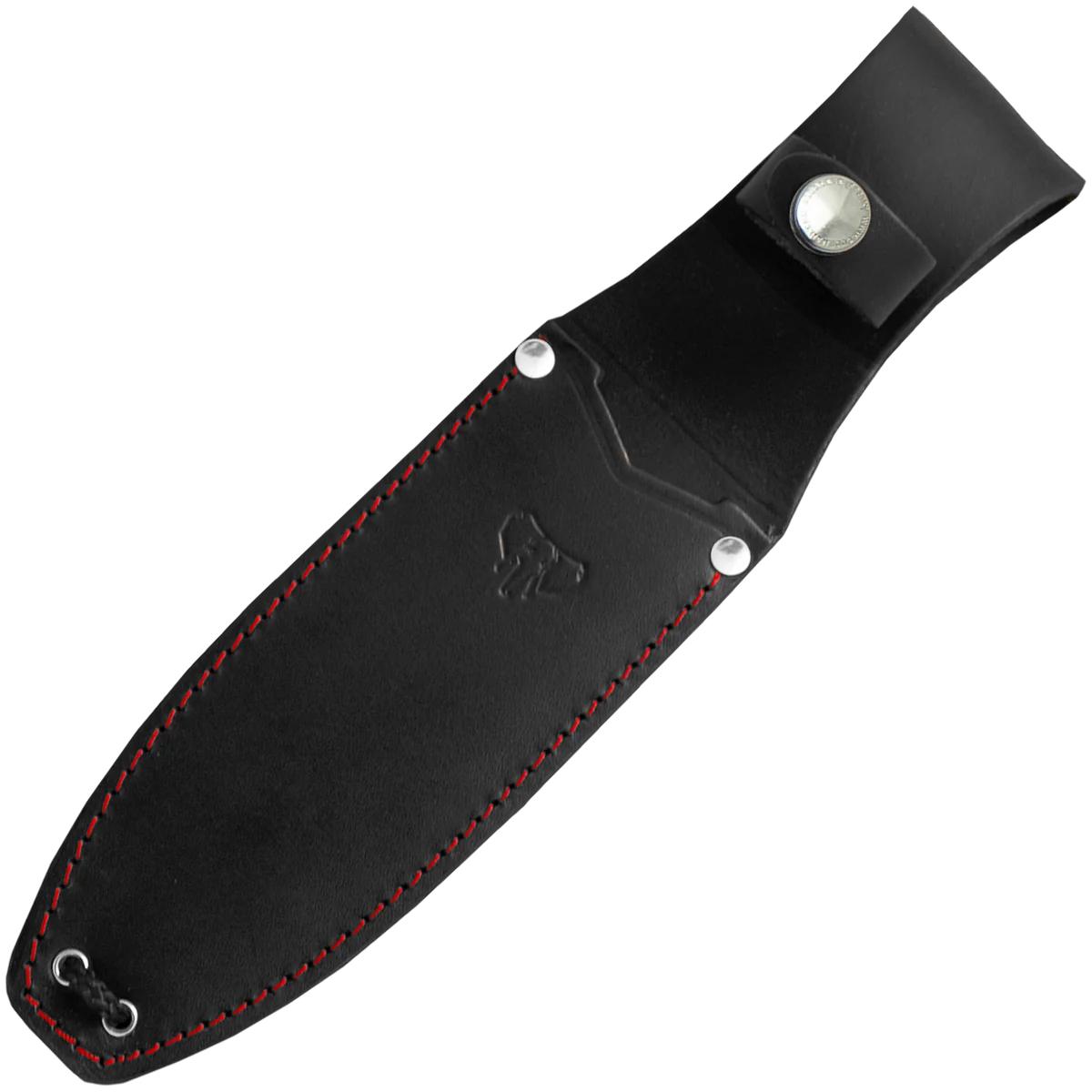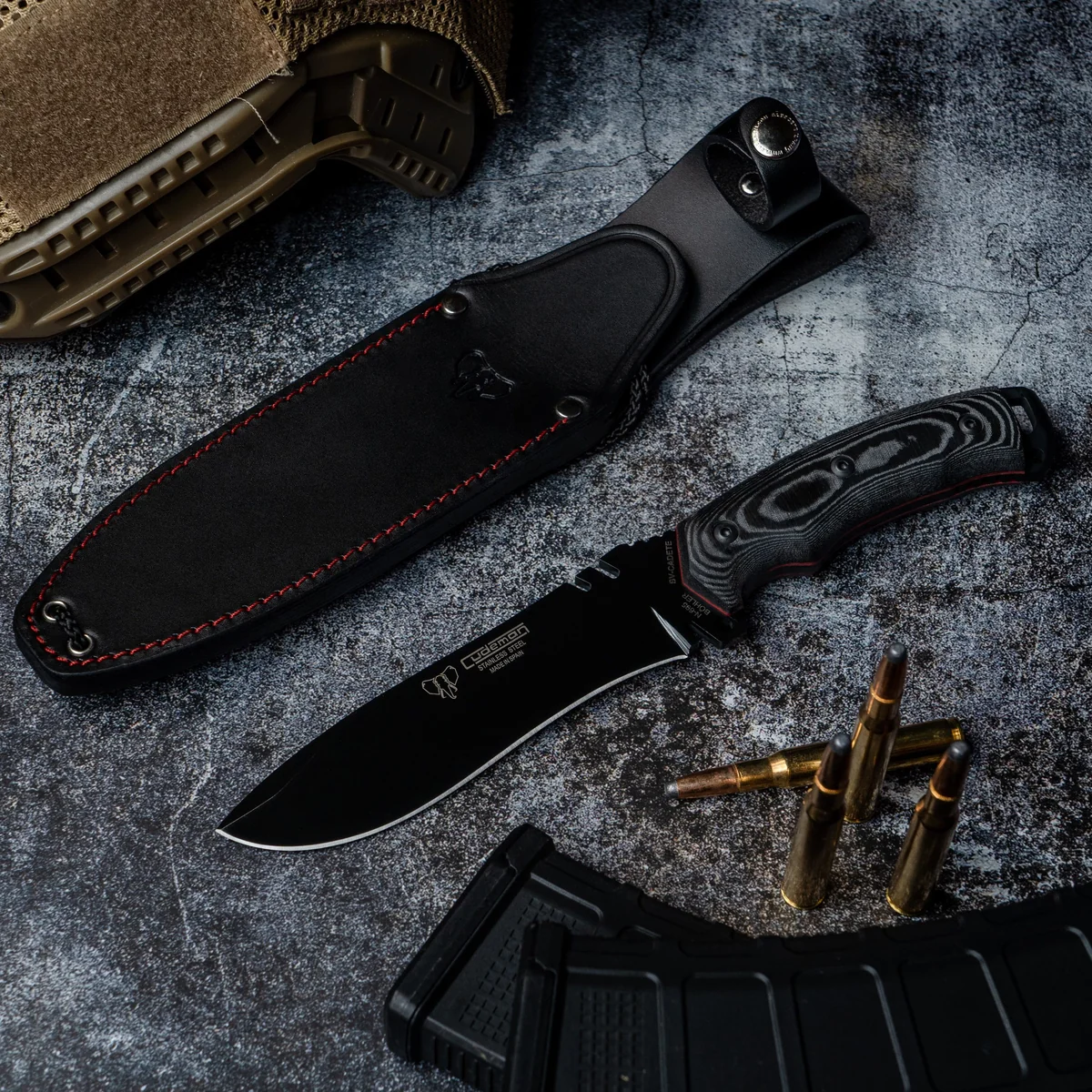 - Ergonomic satin-black Micarta handle with red spacer; full-tang construction secured by stainless Allen screws and an internal threaded brass tube — 12.5 cm grip.