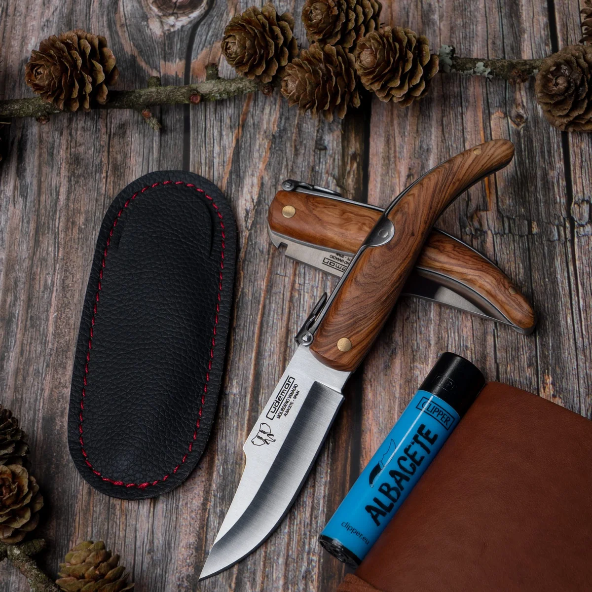 The Cudeman folding knife blends traditional Spanish styling with practical modern construction. Its 8 cm hollow-ground blade with an Albaceteña point and satin finish delivers controlled, precise cuts while the molybdenum‑vanadium steel provides dependable edge performance at 54–56 HRC. At 70 g and 18 cm overall, this knife is compact and easy to handle for everyday tasks. Crafted with a 10 cm satin olive-wood handle secured by a brass pivot anchor, the knife feels balanced and comfortable in hand. The folding action uses a spring mechanism with a palanquilla lever for reliable closure. A black Skay synthetic sheath (629-N) is included for storage and transport; a brown leather option (Ref. 605-C) is available separately.