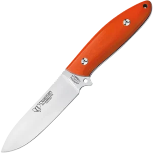 This Cudeman fixed‑blade pairs a compact, purpose‑driven design with premium materials for reliable everyday and outdoor performance. The 11 cm drop‑point blade is precision ground and polished from Böhler N690Co, hardened to 60/61 HRC to deliver a durable cutting edge and strong corrosion resistance. At 4 mm thickness and a 3 cm blade width, it’s built to handle tasks that demand strength and control. The full‑tang construction is matched to a polished orange G10 handle with a black spacer, offering a secure, tactile grip and long‑term durability. Handle fastening uses a special stainless screw and internally threaded brass bushing for a secure fit, and a lanyard pin accepts a retention cord for added security. The knife ships with a black leather sheath (included) for protection and storage — a practical, compact package for fieldwork, bushcraft and general utility use.