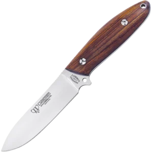 A finely made fixed-blade from Cudeman, this compact knife combines premium materials with straightforward, durable construction. The 11 cm (4.3") drop-point blade is 4 mm thick, ground and polished for reliable edge performance and a clean finish. Crafted from Böhler N690Co and heat-treated to 60/61 HRC, the blade balances corrosion resistance with excellent edge retention for routine cutting, campsite tasks and workshop use. The full-tang design is paired with an 11.5 cm polished cocobolo handle and a black spacer, giving a secure, comfortable grip. Handle scales are fixed with a special stainless screw and an internal brass-threaded bushing for solid long-term anchoring. The knife comes supplied with a brown leather sheath and includes a lanyard pin for a tether cord, making it a practical, well-appointed tool for a wide range of everyday and outdoor applications.