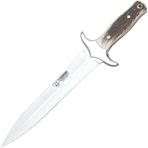 - 14 cm polished natural antler handle, full-tang construction with aluminium peened rivet and polished 420 stainless guard for a secure, ergonomic grip.