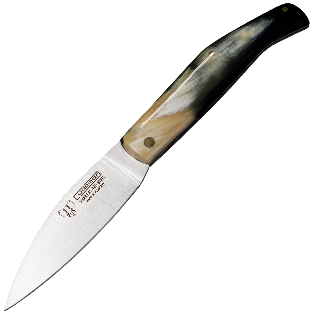 A compact, traditional fixed-blade from Cudeman, this knife pairs a practical 9 cm drop-point blade with a comfortable polished bull-horn handle. At 20 cm overall and roughly 90 g, it offers a balanced, lightweight profile that suits a wide range of everyday outdoor and workshop tasks. The satin finish and precision-ground edge deliver clean initial cutting performance and a neat, low-reflective appearance. Constructed in 420 stainless steel hardened to 52–53 HRC, the blade is designed for corrosion resistance and easy maintenance, with straightforward resharpening when required. The handle is anchored with a brass pin for secure assembly and a classic look; a matching black leather sheath (Ref. 633‑N) is available separately. This knife is well suited to general-purpose use where a compact, reliable fixed blade is needed.