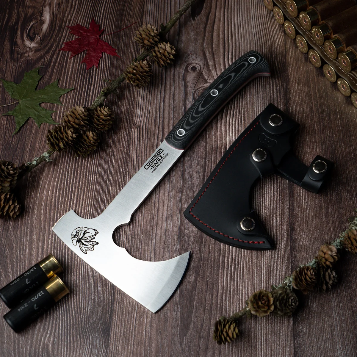 A compact, purpose-built axe from Cudeman designed for outdoor tasks and workshop use. The 15 cm ground, satin-finish blade and 14 cm cutting face deliver dependable performance across chopping, kindling and general woodcraft duties, while the 30 cm overall length keeps the tool highly controllable and portable. At around 390 g, it balances power and manoeuvrability for close-quarters work. Crafted on a full-tang Böhler N-695 stainless steel head hardened to 59/60 HRC, this axe offers strong edge retention and corrosion resistance. The 15 cm black Micarta handle with a red spacer is finished for a secure grip and anchored by a hollow aluminium ferrule. A black leather sheath is included to protect the blade in storage and transit, and a lanyard pin allows fitting of a retention cord for added security in the field or on a belt rig.