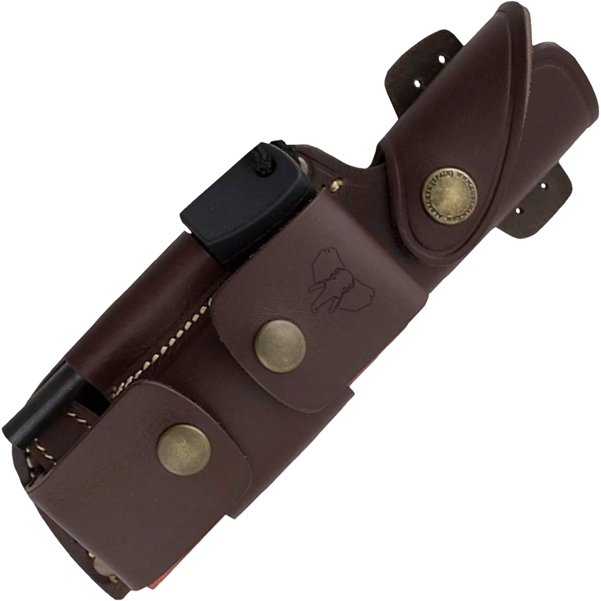 - Brown leather multiposition sheath included with full leather adapter 644‑C — contains sharpening stone, signal mirror, sun compass, ferrocerium striker and 2.80 m brown paracord; sheath weight approx. 280 g.