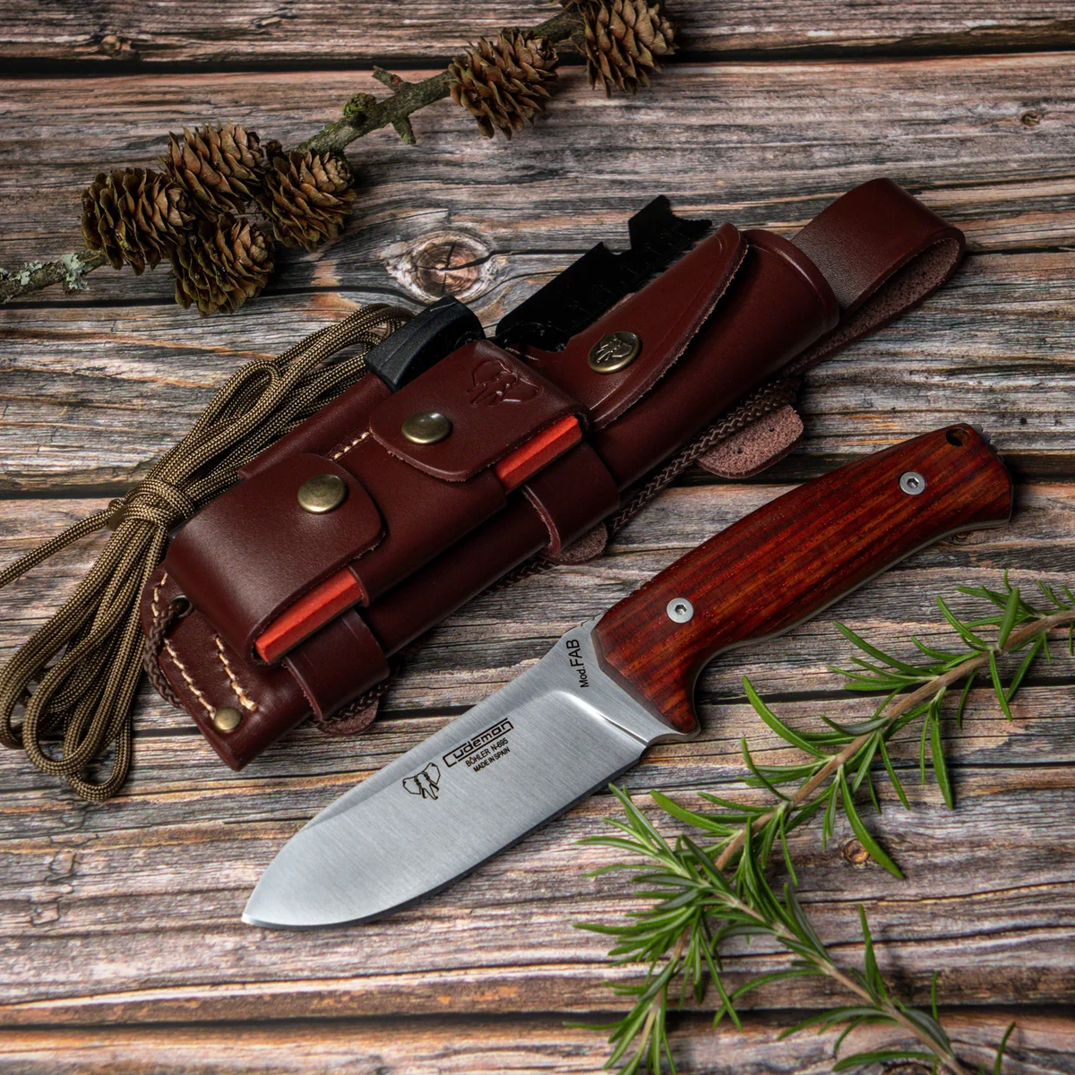 The Cudeman fixed‑blade combines a stout 5 mm thick Blatt with full‑tang construction to deliver a dependable tool for rugged outdoor use. The 11 cm (4.3") drop‑point blade is finished in satin and ground for a keen working edge, while Böhler N‑695 stainless steel heat treated to 59/60 HRC provides a balance of edge retention and corrosion resistance. Ergonomically shaped cocobolo scales give a secure, comfortable grip and are fastened with a stainless Allen screw and a threaded brass inner ferrule for long‑term stability. The knife ships with a brown leather multiposition sheath and a full leather adapter (644‑C) that expands its utility—this kit includes a sharpening stone, signal mirror, sun compass, ferrocerium striker and 2.80 m of paracord, making the set a ready‑to‑use package for general outdoor and prepared‑camp tasks.