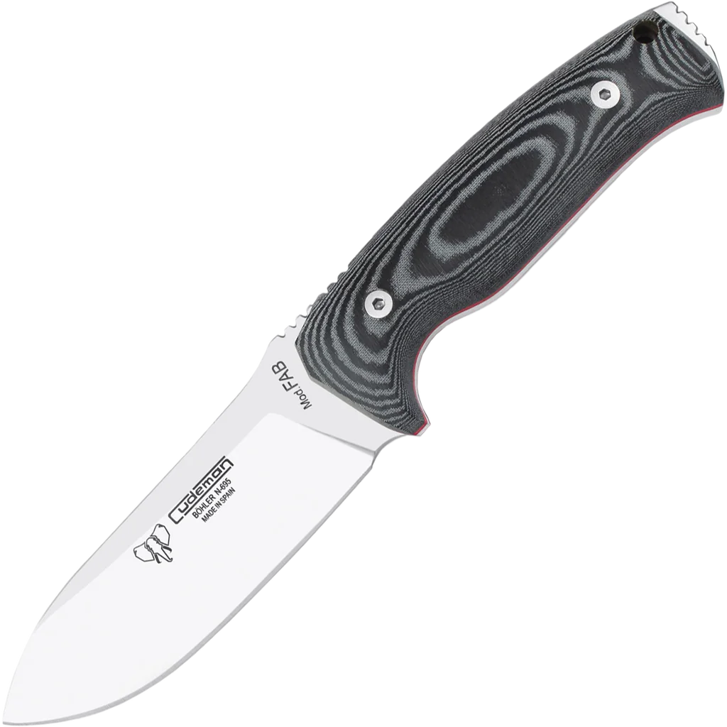 This Cudeman fixed-blade knife combines a compact, practical profile with robust construction for demanding outdoor and utility use. The 11 cm satin-finished drop-point blade is 5 mm thick and ground for consistent cutting performance, while the full-tang build and secure handle anchoring deliver reliable strength and control. Practical features include a lanyard pin, a serrated spine for additional utility and a reinforced pommel designed for impact tasks. Blade steel is Böhler N-695, hardened to 59–60 HRC to provide a strong edge and good corrosion resistance in the field. The handle is sculpted black Micarta with a red spacer and fastened with a stainless Allen screw into an internal brass threaded ferrule for long-term serviceability. A black leather multiposition sheath is included to suit different carry preferences and keep the knife protected when not in use.