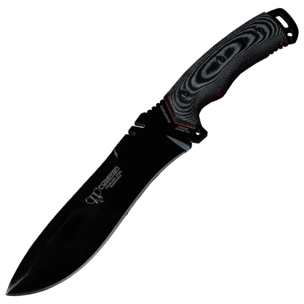 A substantial fixed-blade designed for heavy-duty outdoor and utility use, this Cudeman knife pairs a 5 mm thick, 18 cm hollow-grind blade with full-tang construction for uncompromising strength. The clip-point profile offers a fine, controllable tip for precise tasks while the pavonado (blued) finish helps protect the Böhler N-695 steel against wear and corrosion. Heat-treated to 59–60 HRC, the blade balances edge retention with ease of maintenance. The satin-black Micarta handle has a red spacer for visual contrast and is fastened with stainless Allen screws and a brass-threaded inner bushing for solid retention. Practical details include jimping on the spine for positive thumb purchase, a lanyard pin, and built-in glass- and wire-breaker features. A black leather multiposition sheath (Adapter 642-N) is supplied and includes a compact survival kit — sharpening stone, signal mirror, sundial, ferrocerium striker and 2.80 m red paracord — giving flexible carry and field utility right out of the box.