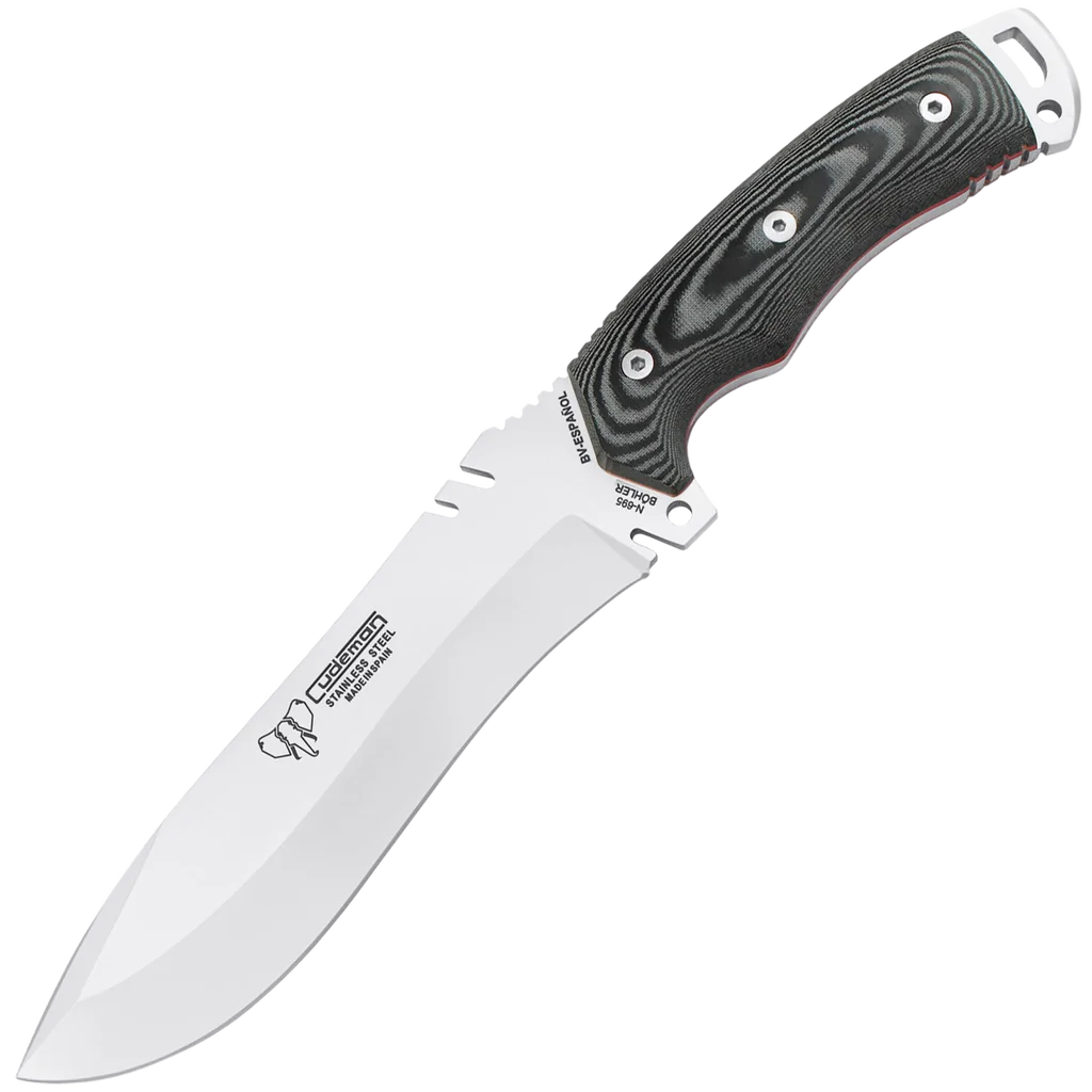 This Cudeman fixed‑blade knife combines thoughtful design with robust materials for reliable performance in demanding tasks. The full‑tang construction and stout 5 mm blade thickness deliver strength and stability, while the hollow‑grind, satin‑finished clip‑point blade provides a fine working edge and precise tip control. Jimping on the spine improves thumb purchase and handling in tougher jobs. Crafted from Böhler N‑695 stainless steel hardened to 59–60 HRC, the blade offers a strong balance of edge retention and corrosion resistance. The satin‑finished black Micarta handle with a red spacer is ergonomically shaped and fastened with a stainless Allen screw into a threaded brass bushing for long‑term secure assembly. Practical features include a lanyard pin, glass breaker and wire breaker, and a black leather multiposition sheath is supplied for versatile carry and protection.