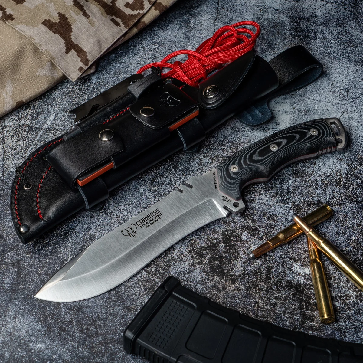 - Included multi‑position black leather sheath (adapter 642‑N) with sharpening stone, signal mirror, sundial, flint and 2.8 m red paracord for field maintenance and signalling.