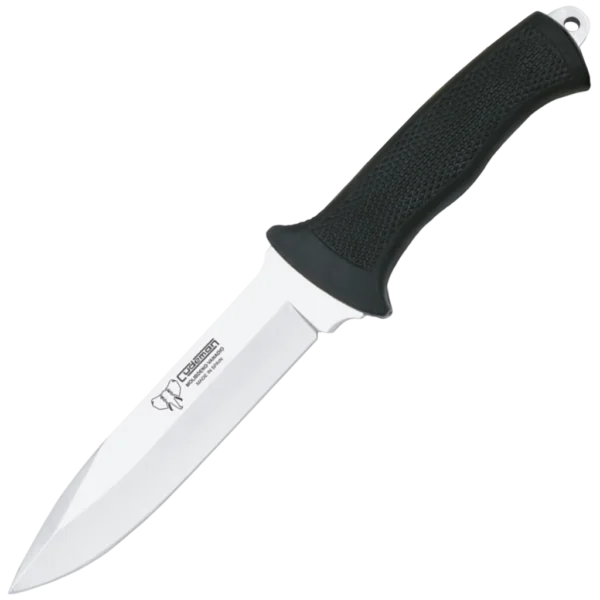 - 13 cm injected black rubber handle with full‑tang construction, lanyard pin and striking pommel for secure grip and impact tasks.