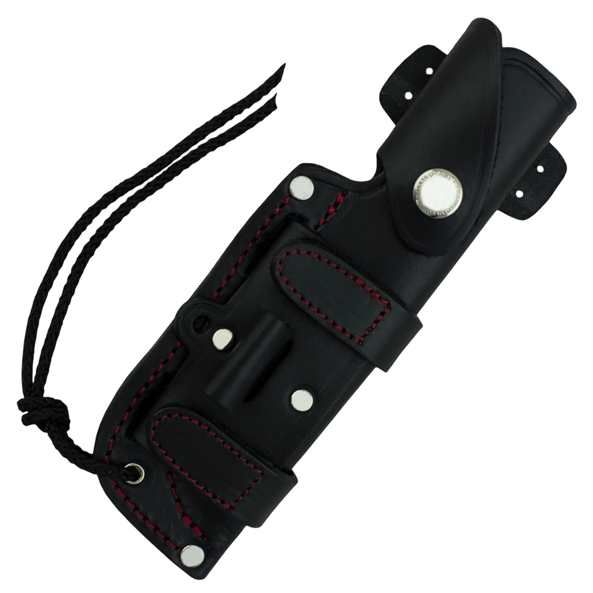 - Black leather multi-position sheath with red stitching, belt loops and rivets for vertical or horizontal carry; accepts sharpening stone/firesteel adapter (included) and weighs ~110 g.