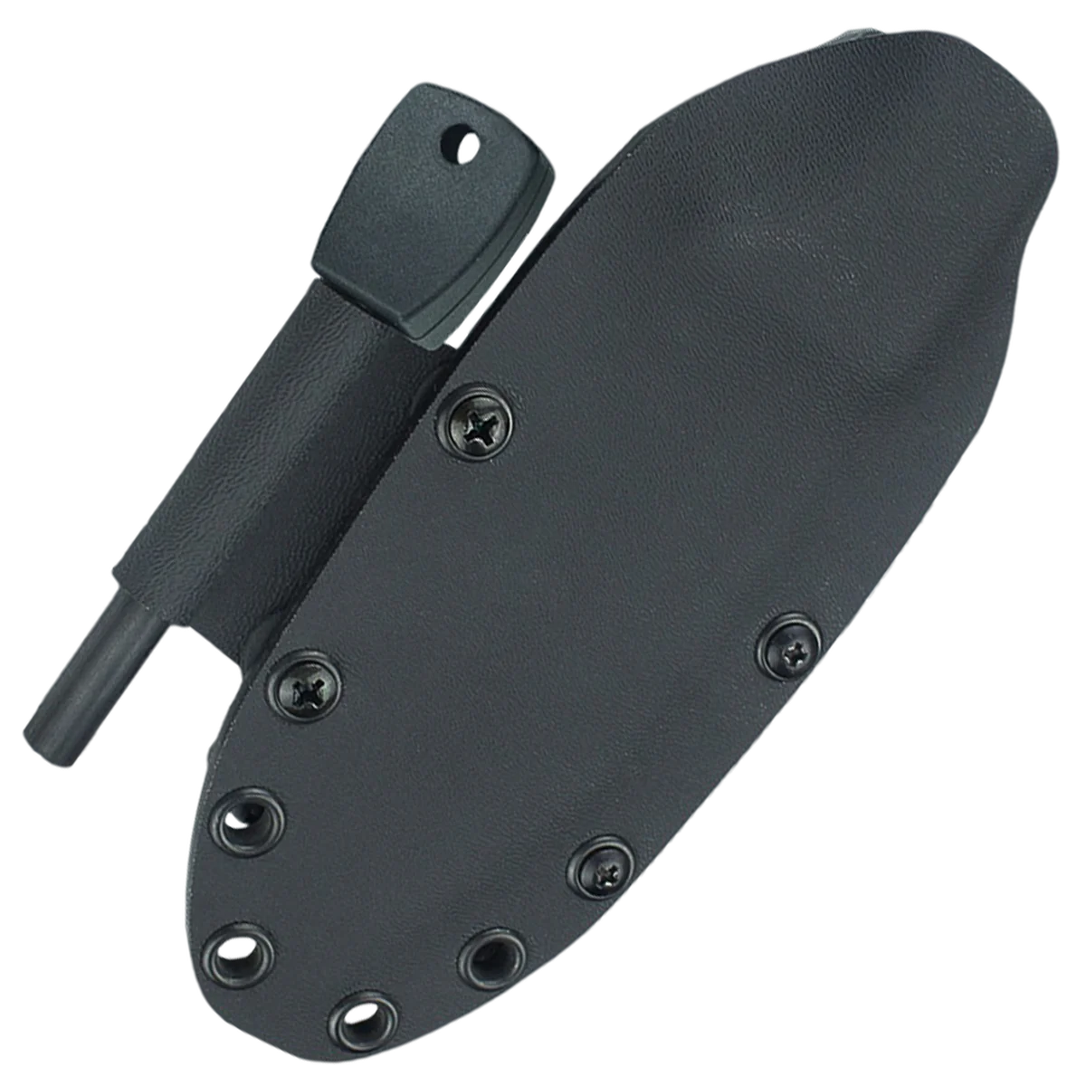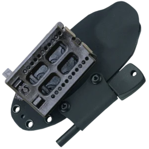 - Custom-moulded black Kydex sheath included with Tek-Lok adapter, dedicated firesteel holder and ferrocerium firesteel — multi-position carry, each sheath moulded to its knife to avoid play.