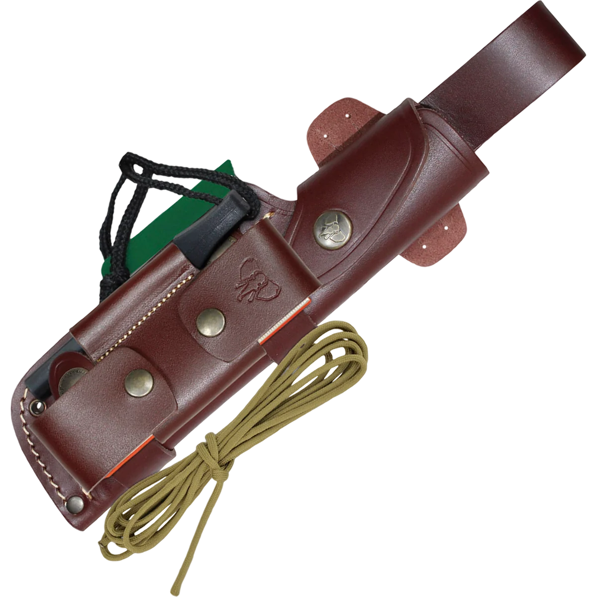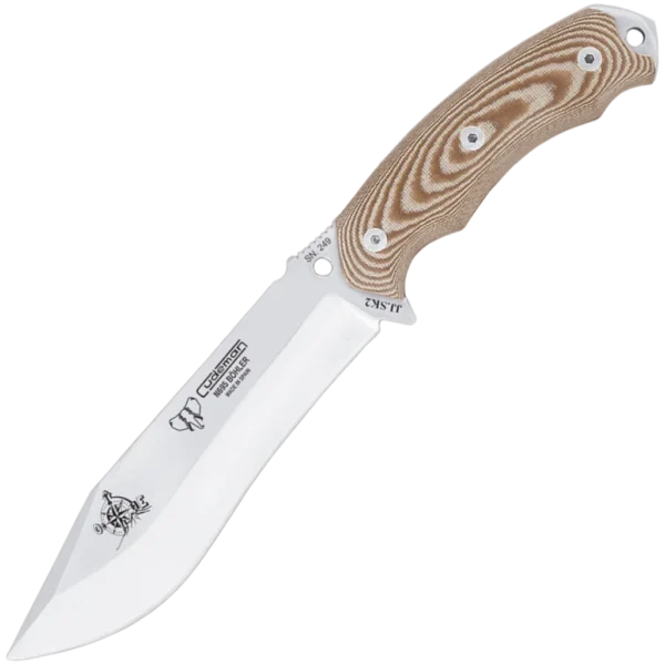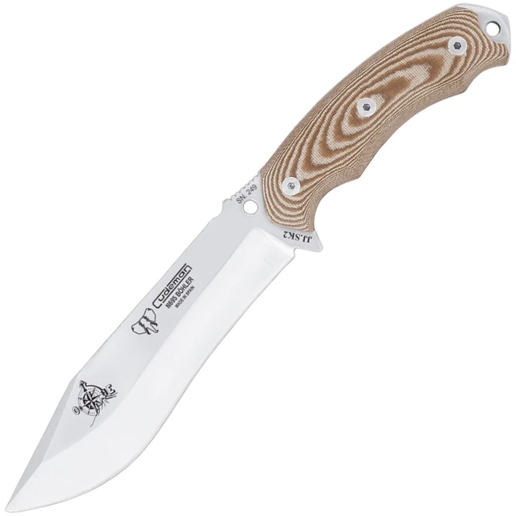 Cudeman survival knife with Böhler N-695 stainless steel, brown micarta with black liners handle, multi-position brown leather sheath. It includes a hole for safety cord, glass-breaker, groove on the spine to make sparks, indentation for advanced fire lighting with a wooden bow technique, paracord 280 cm, firesteel, leather loop with accessories, sharpening stone and signaling mirror.