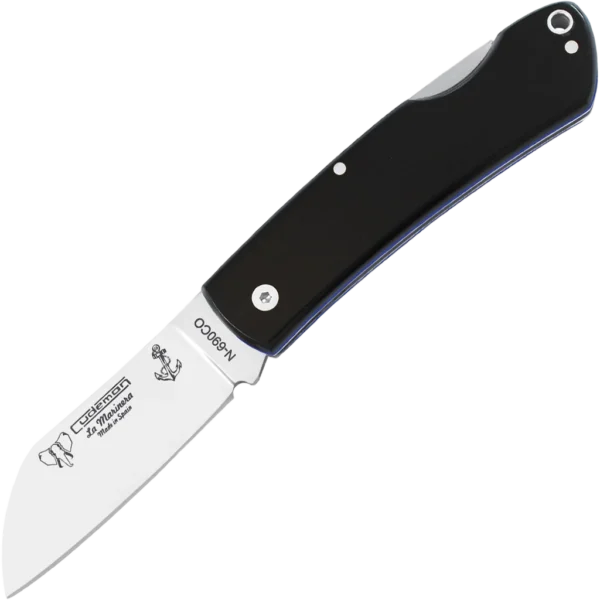 This Cudeman folding knife pairs compact dimensions with precision cutting performance. The 7 cm bird's‑beak blade is ground to a fine edge and shaped for controlled, fine work where a precise tip matters. A secure back‑lock keeps the blade safely open during use, while the built‑in lanyard pin offers a simple way to attach the knife to a line or carry cord. Built from Böhler N690Co stainless steel and hardened to 60/61 HRC, the blade combines strong edge retention with corrosion resistance and a satin finish for a refined appearance. The handle is polished black Phernocraft with a contrasting blue spacer and steel anchoring hardware, delivering a durable, comfortable grip. The knife is lightweight (approx. 80 g) and compact (overall length 16.5 cm) — a practical choice for everyday tasks. Note: black leather sheath Ref. 605-NA is available separately (not included).