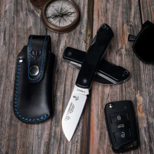 A compact, well-crafted folder from Cudeman designed for everyday utility and precise cutting tasks. The 7 cm hollow-ground blade is finished in satin and shaped with a parrot's-beak (pico de loro) tip for excellent control on detailed cuts. Built from Böhler N690Co stainless steel and hardened to 60/61 HRC, the blade offers a strong, long-lasting edge with reliable corrosion resistance. The handle pairs polished black Phernocraft with a contrasting blue spacer and steel pin anchoring for a solid, ergonomic grip. A secure back-lock keeps the blade confidently locked open in use. The knife ships with a black leather sheath (Ref. 605-NA) and includes a lanyard pin for tethering — a compact, lightweight option at approximately 80 g for the knife and 40 g for the sheath.