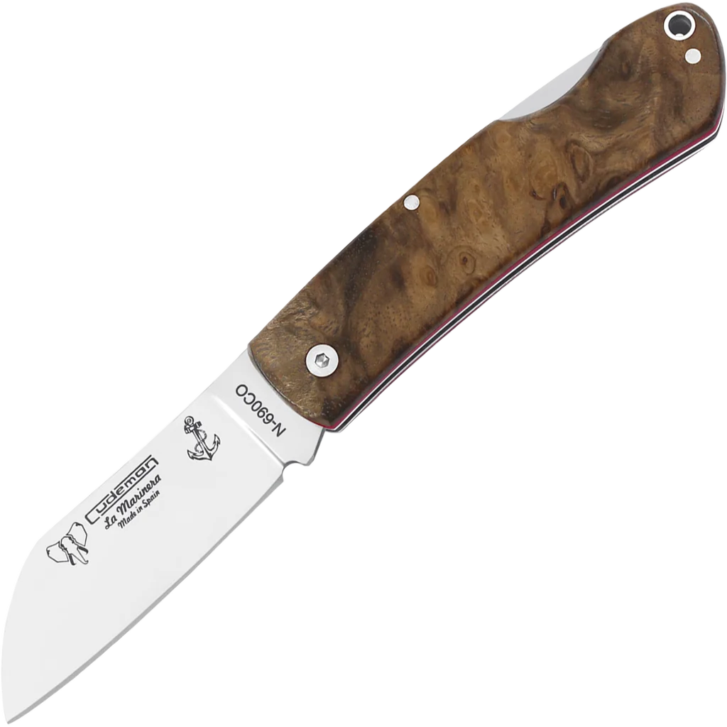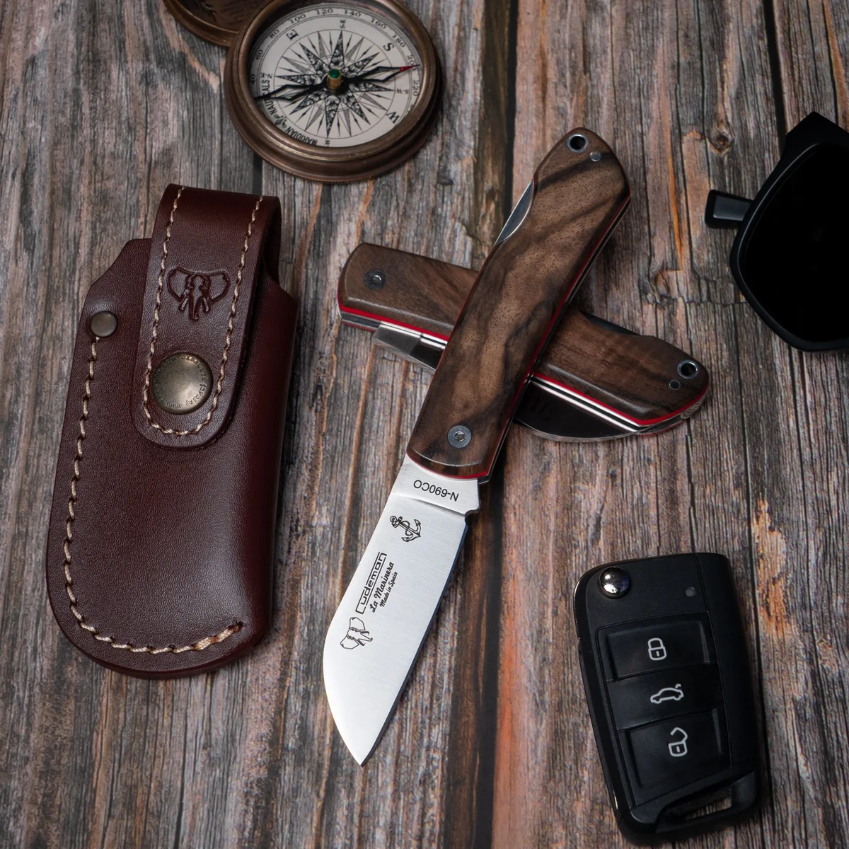 The Cudeman folding knife pairs a compact, precision blade with quality materials and traditional styling. The 7 cm hollow-ground blade features a parrot‑beak tip and a satin finish for controlled cuts and easy maintenance. Made from Böhler N690Co stainless steel and heat-treated to 60–61 HRC, the blade delivers strong edge retention and solid corrosion resistance in a small package. The handle is crafted from polished walnut with a contrasting red spacer and steel pin anchorage, giving a secure and comfortable 9.5 cm grip. A reliable back‑lock keeps the blade secure when open, and a lanyard hole adds carrying versatility. The knife comes with a brown leather sheath (Ref. 605-C) for protected storage and transport — overall length 16.5 cm and a lightweight profile make it a practical choice for everyday cutting tasks and general outdoor use.