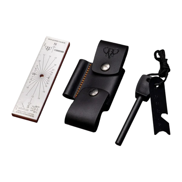 • Flint and sharpening stone housed in a black leather pocket which can be easily attached to an existing leather sheath.