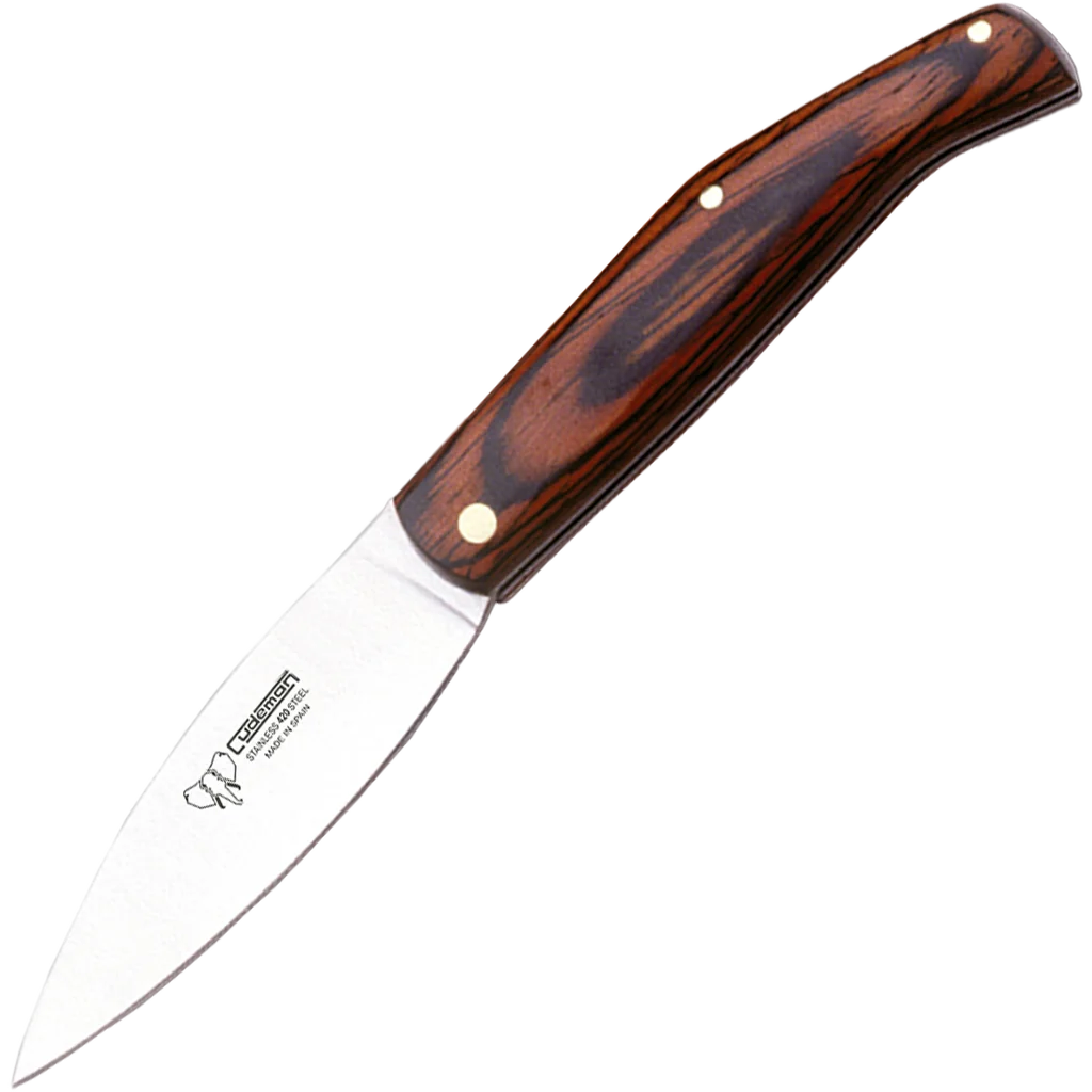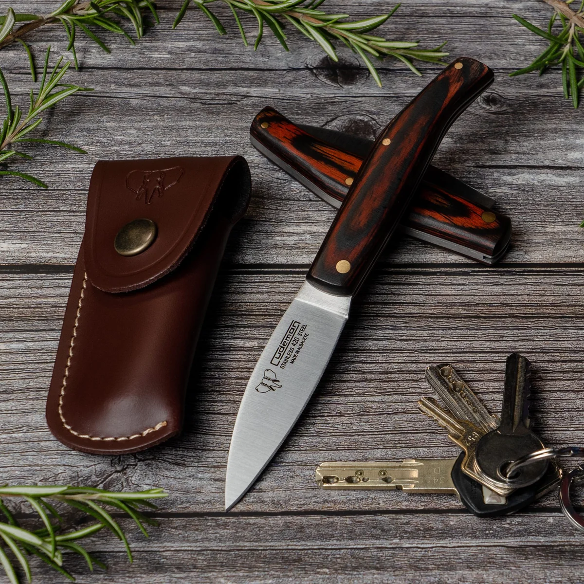 This Cudeman fixed-blade is a compact, well-balanced tool built for everyday cutting tasks. It features an 8 cm drop-point blade with a satin finish and a finely ground edge, giving good tip control and a clean cutting performance. The blade is made from 420 stainless steel hardened to 52/53 HRC, offering dependable corrosion resistance and ease of re-sharpening. The handle is a satin-finish red Estamina with brass pin fastening, sized at 9.5 cm for a comfortable, secure hold. Supplied with a brown leather sheath (Ref. 634-C), the knife is easy to carry and store while remaining lightweight — the knife weighs approximately 60 g with the sheath around 33 g. Practical, durable and neat in finish, it’s a compact fixed blade suited to a wide range of everyday tasks.