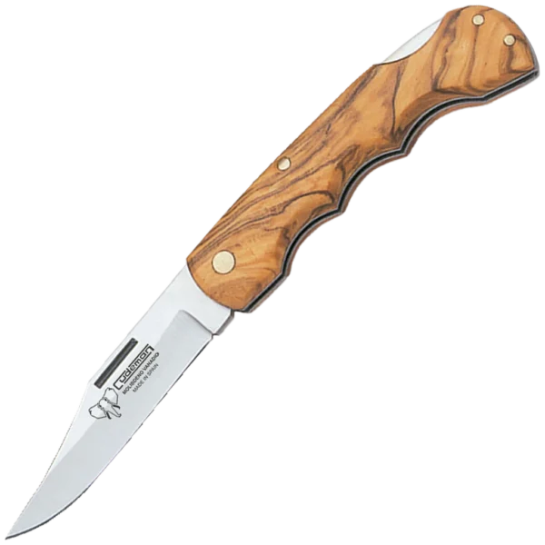 This Cudeman folding knife pairs traditional Spanish styling with practical, everyday performance. The 6.5 cm satin-finished clip-point blade is hollow-ground to deliver precise, controlled cuts while the 2 mm blade thickness and 1.5 cm blade width keep the profile slim and manoeuvrable for detailed tasks. The blade steel is a molybdenum‑vanadium alloy heat-treated to 54–56 HRC, offering a balance of edge retention and straightforward maintenance. The handle is crafted from natural satin olive wood and secured with brass pin fastening for a timeless look and comfortable feel in the hand. A reliable back-lock keeps the blade safely open during use. Supplied with a brown leather sheath (Ref. 635-C) for neat storage and transport, this folding knife is a compact, well-finished tool suited to everyday utility and general cutting needs.