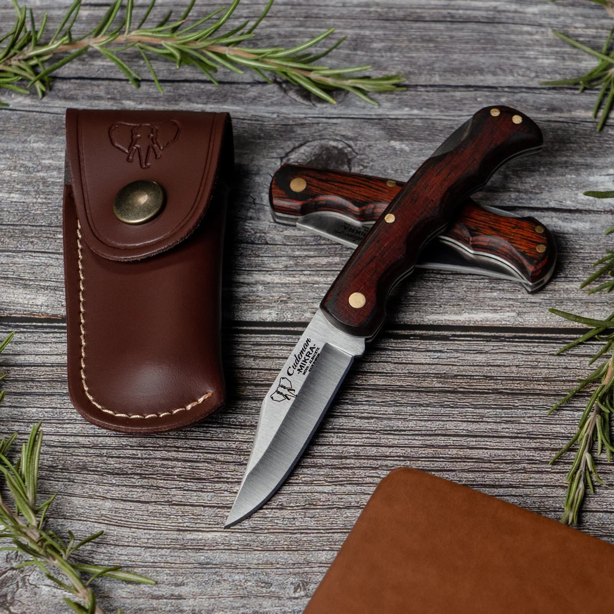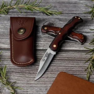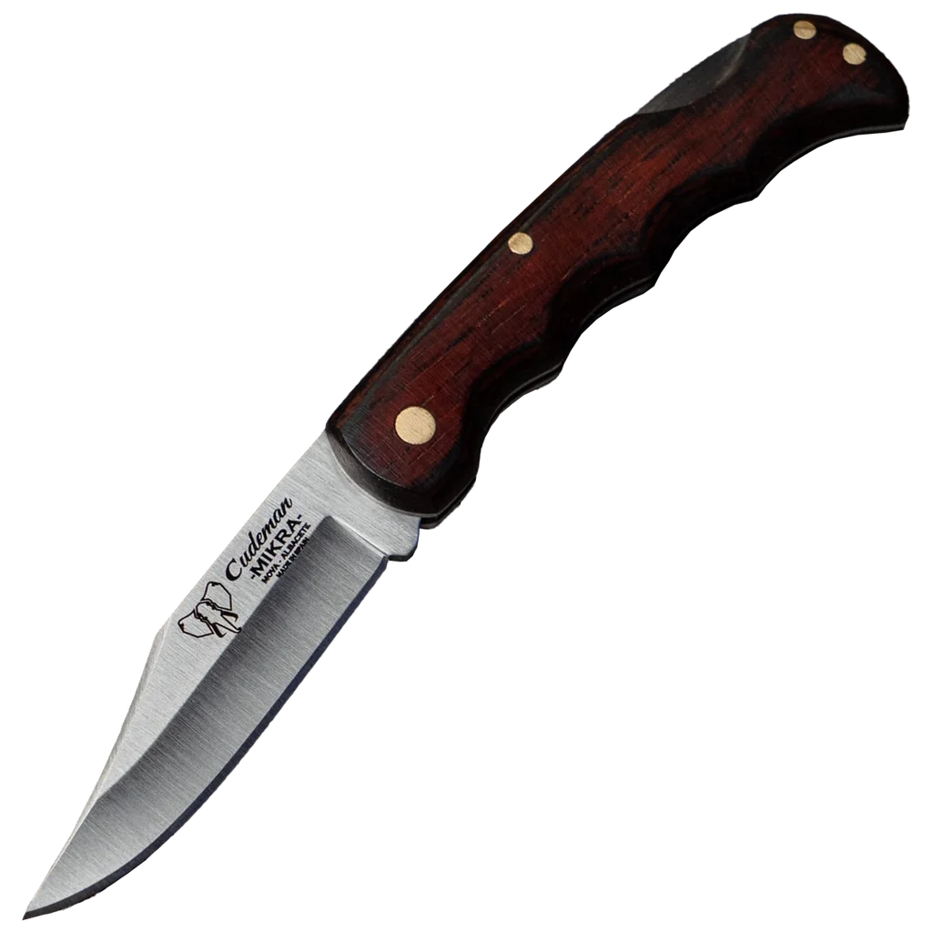 The Cudeman folding knife pairs compact, traditional styling with practical performance. A 6.5 cm hollow‑ground clip‑point blade in a satin finish gives precise control for detail work and everyday cutting tasks, while the 2 mm blade thickness and 1.5 cm blade width balance strength and finesse. The blade steel is molybdenum‑vanadium, heat treated to 54–56 HRC to deliver dependable edge life while remaining straightforward to resharpen. Built for comfortable, lightweight carry, the 8.5 cm red Estamina handle is satin finished and secured with brass anchoring for durability. The back‑lock system provides secure blade locking during use. A brown leather sheath (Ref. 635‑C) is included for protective storage and convenient transport. At approximately 45 g for the knife and 27 g for the sheath, this folding knife is easy to carry and well suited to general utility, craft and everyday tasks.