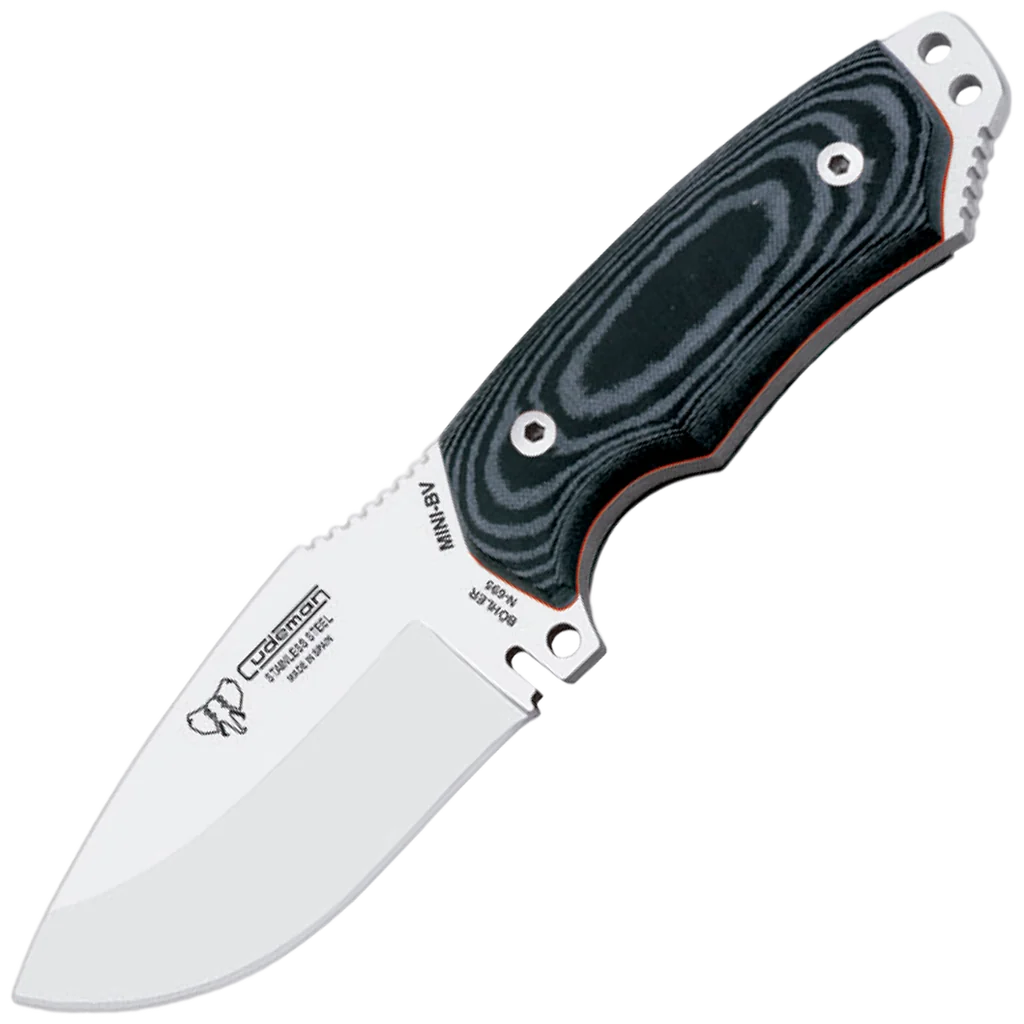 The Cudeman Mini Boina Verde is the compact member of the renowned Boina Verde family, offering a proven combination of strength and manoeuvrability in a small package. With a 9 cm (3.5") hollow-ground drop-point blade and a 5 mm spine, this fixed blade delivers crisp cutting performance while remaining comfortable and controllable for a wide range of outdoor and tactical tasks. Its reduced dimensions make it an excellent choice when a compact, robust knife is required. Construction is solid and purpose-built: Böhler N-695 stainless steel heat-treated to 59–60 HRC sits on a full-tang build with a satin black Micarta handle and red spacer, fastened by a stainless Allen screw and brass threaded ferrule. Practical features include a lanyard hole, glass/wire breaker points and jimping on the spine for improved grip. The knife ships with a custom-moulded black Kydex sheath fitted to the blade, complete with a Tek-Lock adapter and an integrated ferrocerium rod and striker for reliable fire starting — note the sheath is bespoke to each knife and is not available separately.