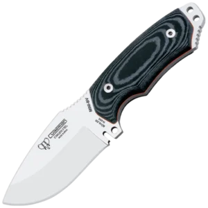 - Full-tang satin black Micarta handle with red spacer, secured by stainless Allen screw and brass threaded ferrule; lanyard hole and spine jimping for secure control.
