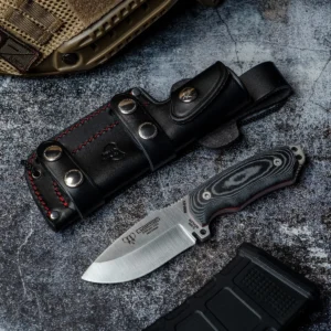 - Full-tang construction with black satin micarta scales and red spacer; secured by stainless Allen screw and threaded brass liner, plus lanyard pin, spine jimping, glass breaker and wire-break features.