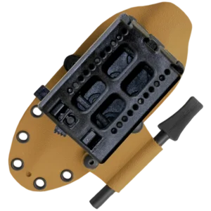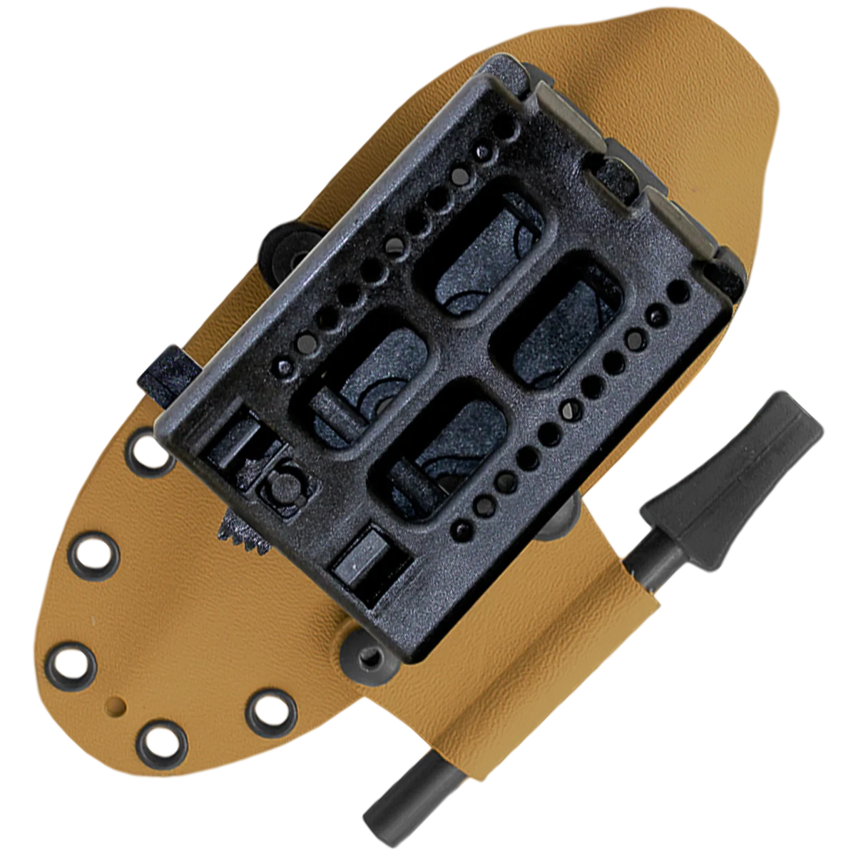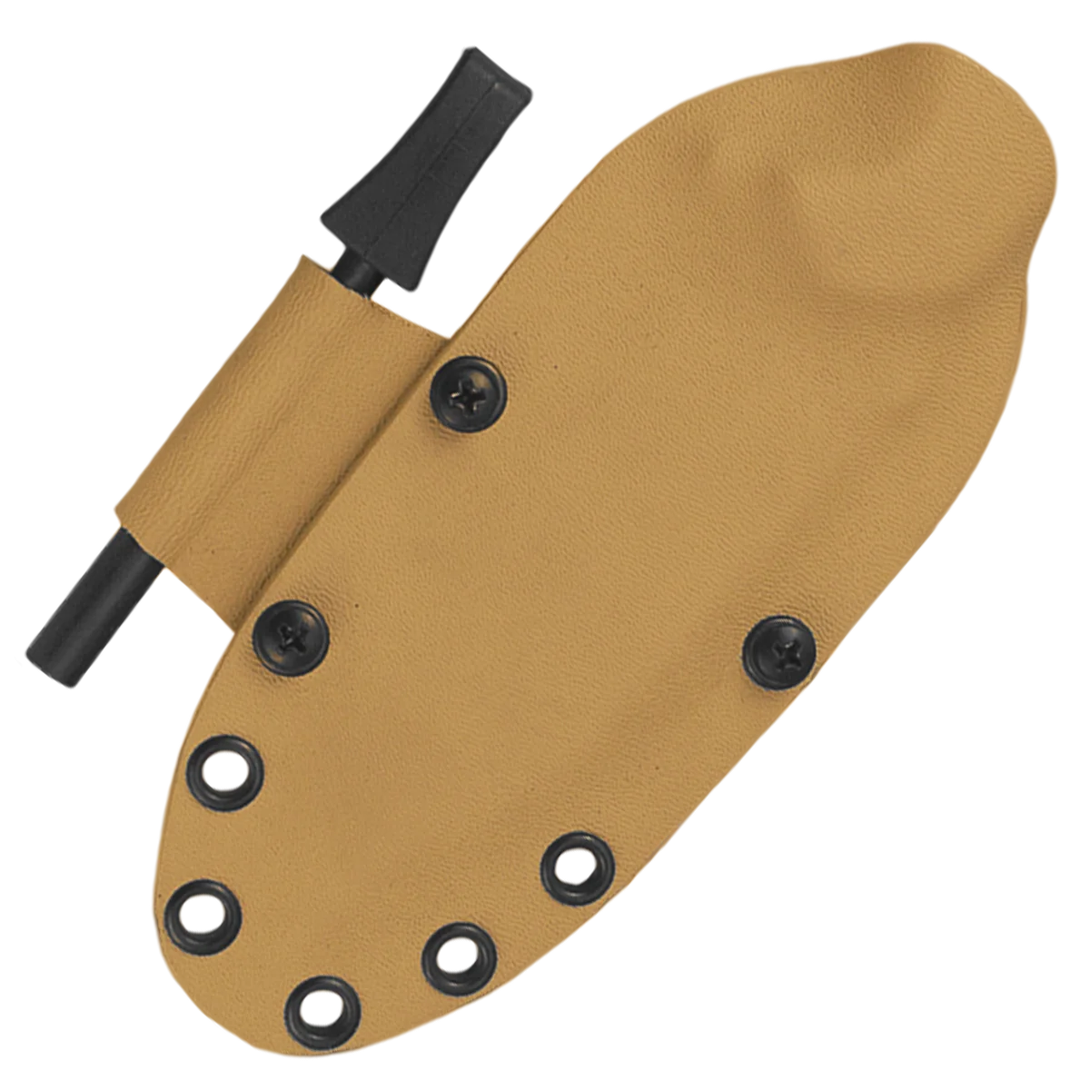 - Includes custom-moulded brown Kydex sheath with Tek-Lock adapter, integrated firesteel holder and matching ferrocerium rod — sheath is moulded to each knife and not sold separately.