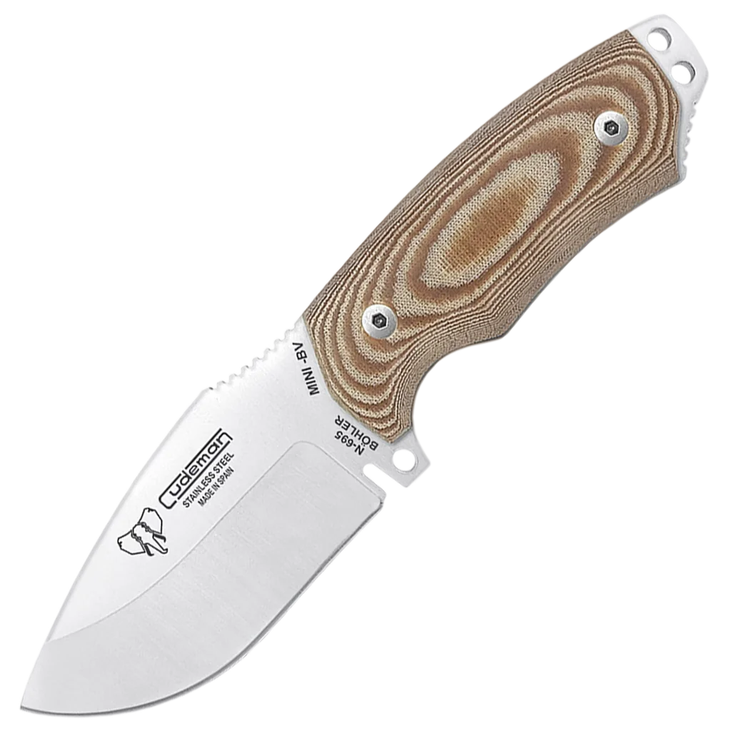 The El Cudeman Mini Boina Verde is the compact member of the Boina Verde family, finished in desert-colour Micarta to blend with arid environments. Its short, robust blade profile and hollow grind deliver controlled, efficient cutting while the 5 mm thickness and drop-point tip provide strength and versatility for a wide range of field tasks and tactical applications. Crafted from Böhler N-695 stainless steel hardened to 59/60 HRC, this knife balances edge retention with corrosion resistance. The full-tang build, brown satin Micarta scales and secure fastening system give a reassuring, ergonomic grip. Each knife comes with a custom-moulded brown Kydex sheath fitted with a Tek-Lock adapter, firesteel holder and matching ferrocerium rod for a ready-to-use kit; the sheath is individually moulded to each blade to ensure a precise fit.
