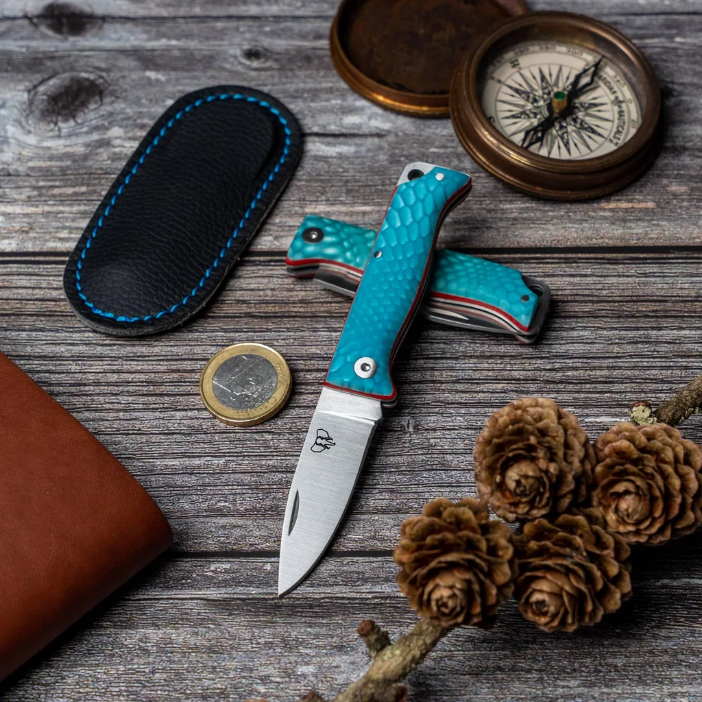 - Blue Juma handle with orange spacer (6.5 cm), steel-pin construction; fitted nail nick and lanyard pin for easy opening and attachment.