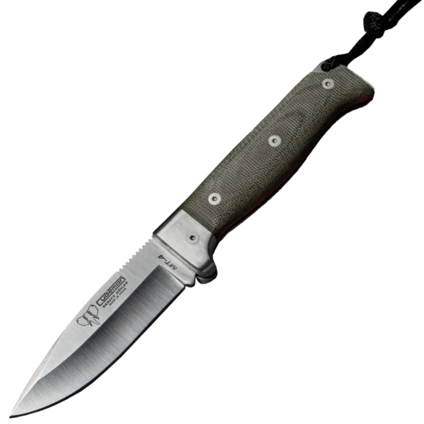 If you are looking for a high quality knife that can withstand even the most extreme situations, the MT4-384FF is the perfect choice for you. This survival knife has been designed with the most advanced and durable features to ensure that you can rely on it in any situation. With a blade length of 9.5 cm and a 12 cm handle, the overall length of the knife is 21.5 cm, making it perfect for storing in your backpack or pocket. The blade thickness of 3 mm and the blade width of 2.5 cm guarantee you great strength and durability. The hollow ground, satin-finished blade with Drop-Point tip and made of Böhler N690Co steel, which has a hardness of 60/61 HRc, is able to cut and withstand prolonged use in extreme situations. In addition, the rear locking locking system and the handle anchorage with stainless allen screw and brass threaded inner bushing ensure that the blade does not close accidentally. The green canvas handle with red spacer is sturdy and comfortable, making it ideal for use in survival situations. The included black leather sheath is perfect for carrying with you wherever you go and is equipped with a lanyard pin, firing pin knob, spine zipper and blade latch. All in all, the MT4-384FF is the perfect survival knife for any outdoor enthusiast looking for a tough, durable and reliable tool for any extreme situation – be sure to have one with you on your next adventure!
