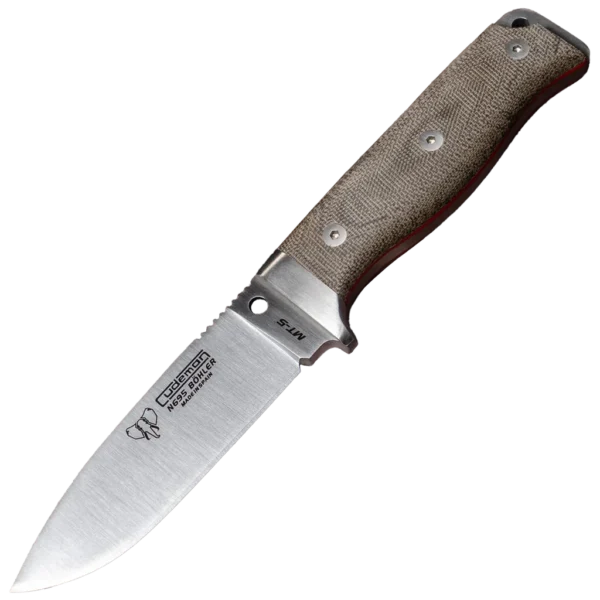 The Cudeman MT-5 is the most famous piece of the brand. This design tops the list of best sellers because it was, is and continues to be a best seller all over the world. Its design is unique and maintains a perfect weight balance. The model, which went on sale in 2012, surpassed its predecessor, the historic Cudeman MT-1. This model has undergone major changes in terms of steel, design and the leather sheath itself. It is currently manufactured with Böhler N-695 steel. It is a full tang knife and has A-304 steel ferrules with satin finish. Its handle is green canvas with red fiber spacers, and at the end of the handle it has a striker pommel. There are two pins on the flat of the blade and on the pommel itself to make a lance with a safety lanyard. The zipper on the spine, makes for a secure and reliable grip. This version includes a Kydex sheath (self-made) with Tec-Lock adapter, flint and flint holder. We remind you that the Kydex holster cannot be purchased separately because each piece is molded with its own Kydex holster to avoid looseness and maintain a perfect fit to the holster. The Cudeman MT-5, a survival knife in its purest form.