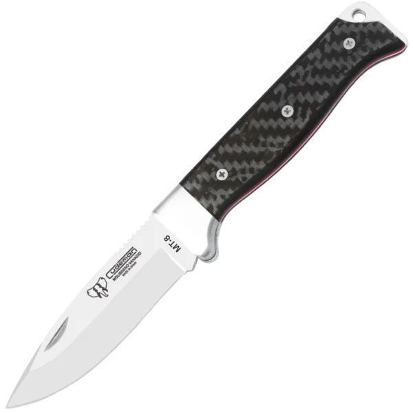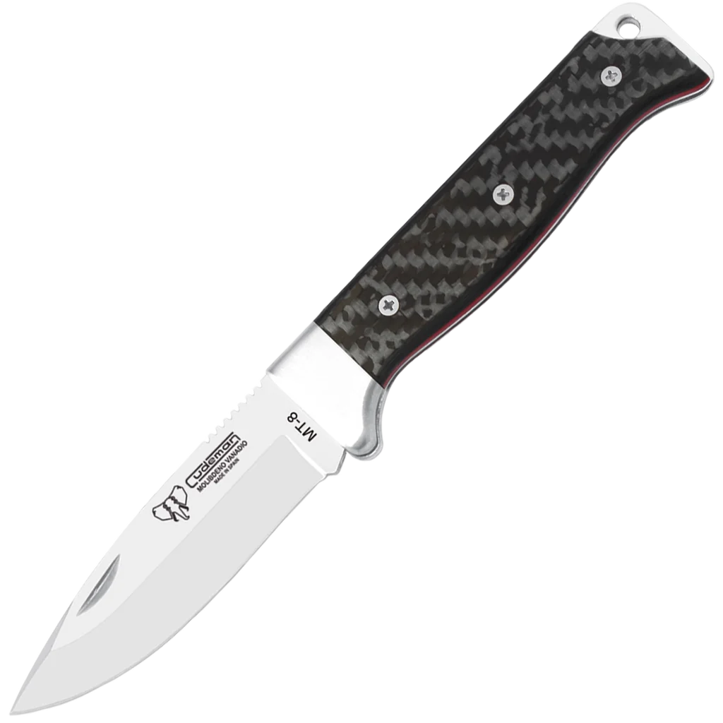 Cudeman MT-8 folding knife with a piston locking system and nail nick opener. Features a 3.14" drop point blade constructed from wear resistant MOVA, stainless steel A-304 bolsters and completed with a sleek black carbon fiber handle with contrasting red spacers.