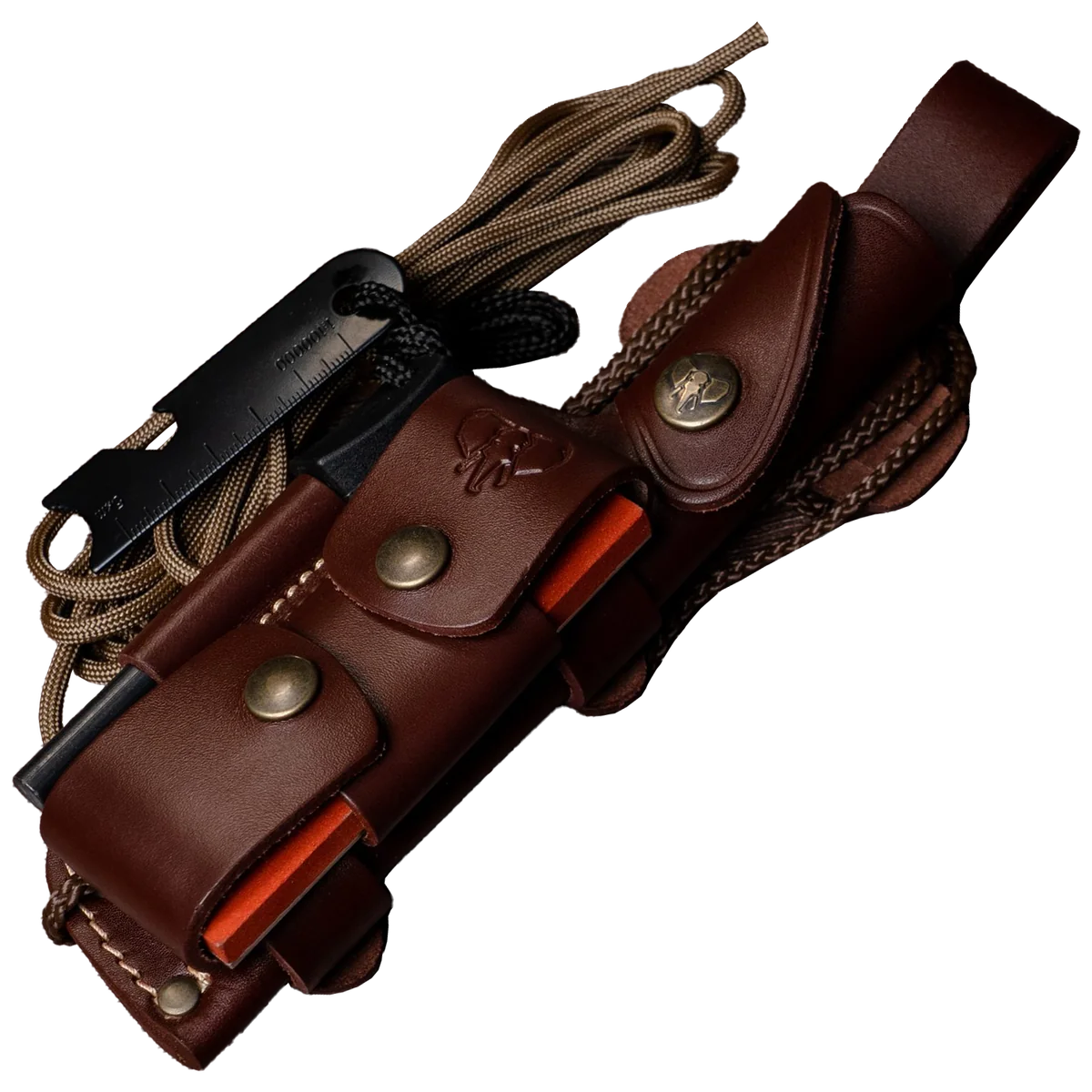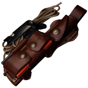 - Includes brown leather multiposition sheath with full leather adapter (644-C) and survival kit: sharpening stone, signal mirror, sundial, ferrocerium striker and 2.80 m brown paracord; sheath approx. 260 g.